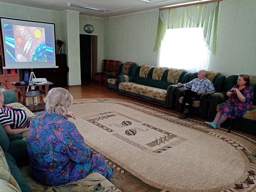 Пожилые люди прослушали интересные детские размышления о космосе и тематические стихи, проиллюстрированные детским рисунками.