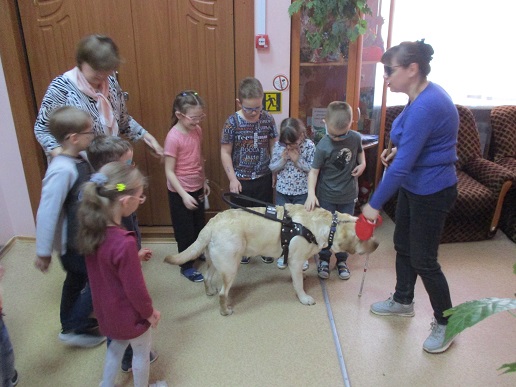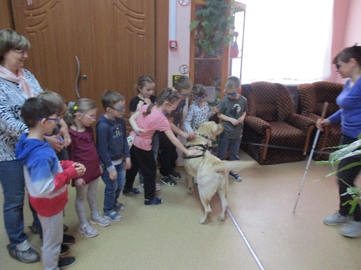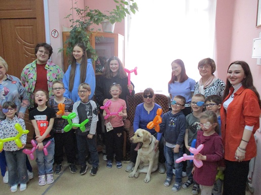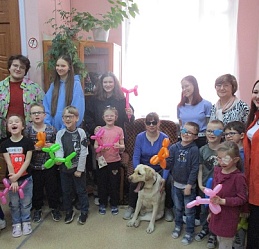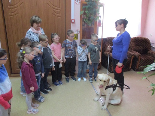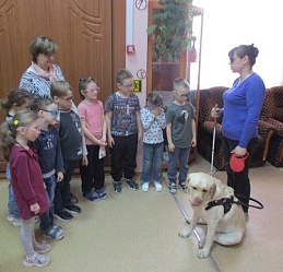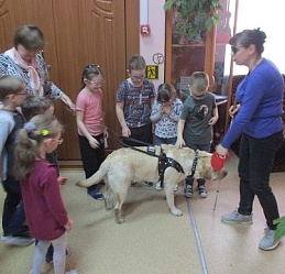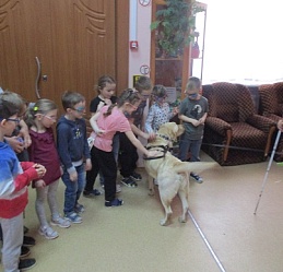 На занятие в Арт- мастерской «Синяя птица», состоявшемся 12 апреля в День космонавтики, пришли воспитанники подготовительной группы и педагоги детского сада компенсирующего вида № 146. Предваряя рисование, дети посмотрели фрагмент мультфильма из сборника «Профессор Почемушкин» о первых космонавтах – собаках Белке и Стрелке; показали свои знание в беседе о профессиях служебных собак. Знакомство с гостьей Арт-мастерской Светланой Каретиной и собакой-поводырём Флаем вызвало у дошкольников, педагогов и студентов-волонтёров неподдельный интерес и восхищение. Дети, конечно же, стремились погладить Флая, который с удовольствием откликался на их порыв. Вместе с хозяйкой-другом Светланой Александровной Флай продемонстрировал свои умения.
