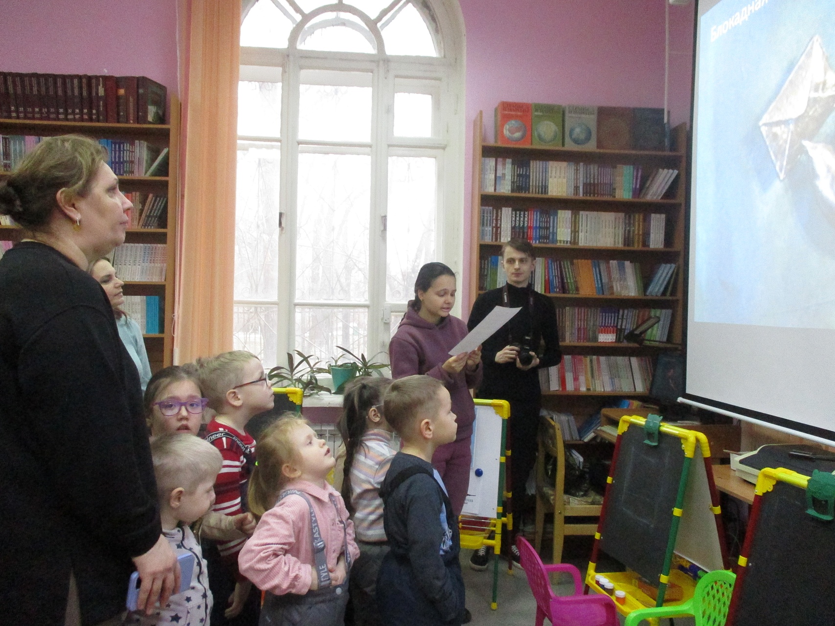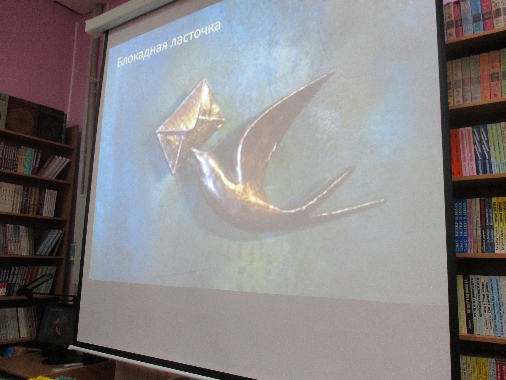Рассказ о стойкости жителей блокадного Ленинграда; о том, как дети и подростки помогали защитникам города, продолжая учиться, сопровождался просмотром фотохроники. Особое внимание было уделено символу веры ленинградцев в Победу – жестяному значку с изображением ласточки с конвертом в клюве. получившему имя «Блокадная ласточка», которую ребята изобразили на своих рисунках.