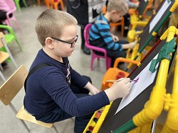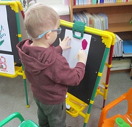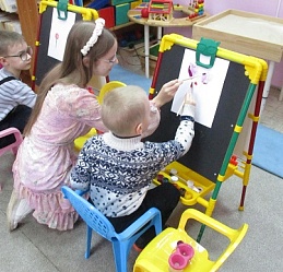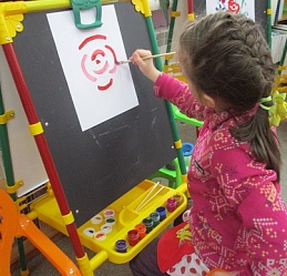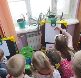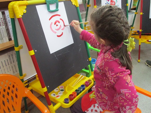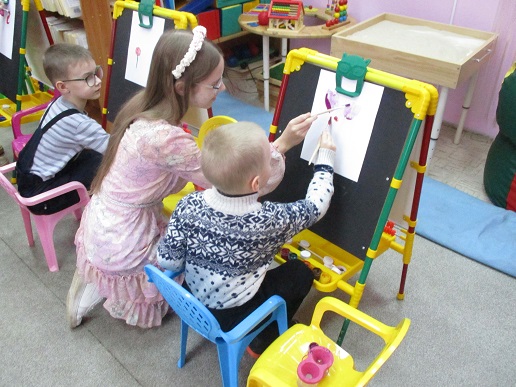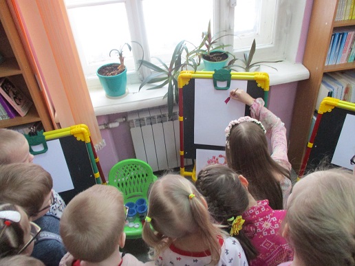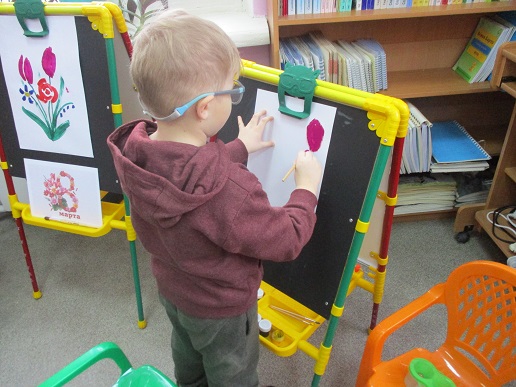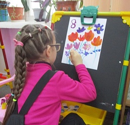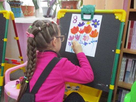Полина-Весна обозначила тему занятия – «Букет для любимой мамы» и на мольберте наглядно показала все приёмы и этапы будущего рисунка.