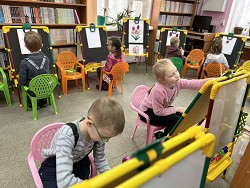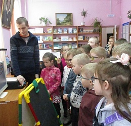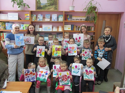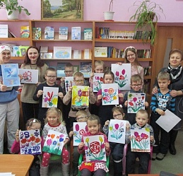 Благодаря юным художникам в первый весенний день в библиотеке на мольбертах в детских рисунках яркими букетами расцвела весна. Воспитанники и педагоги подготовительной группы «Улыбка» детского сада компенсирующего вида вновь пришли на занятие арт-мастерской «Синяя птица», которое началось с общения с читающей машиной «SARA»: дети отгадывали её загадки о весне и маме. Непременная участница арт-мастерской Полина Коптелова, студентка Художественного училища им. М. И. Малютина, на этот раз предстала в непривычном для детей образе: они сразу же дали ей другое имя: Весна.