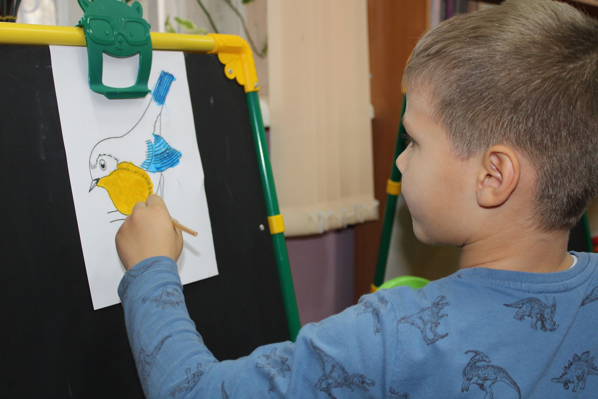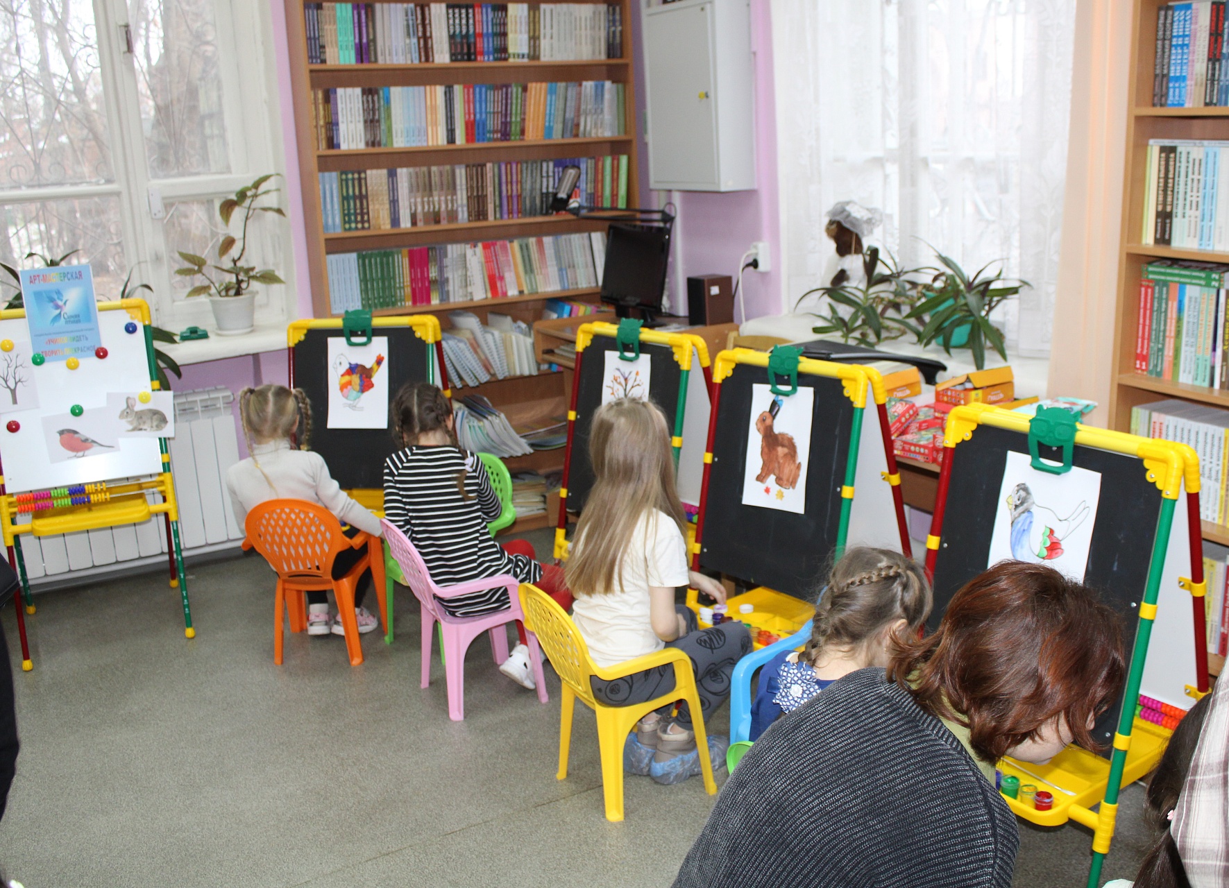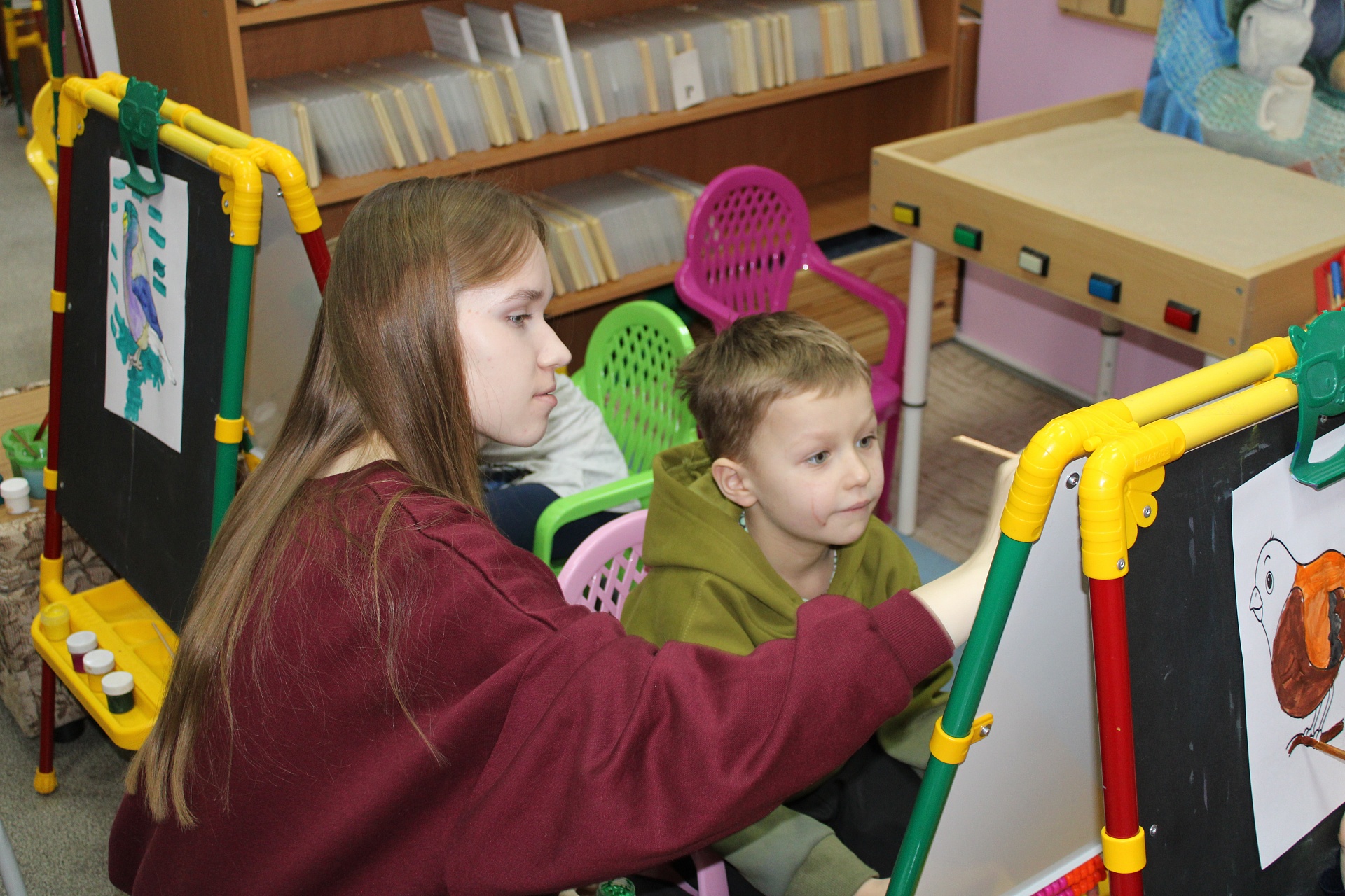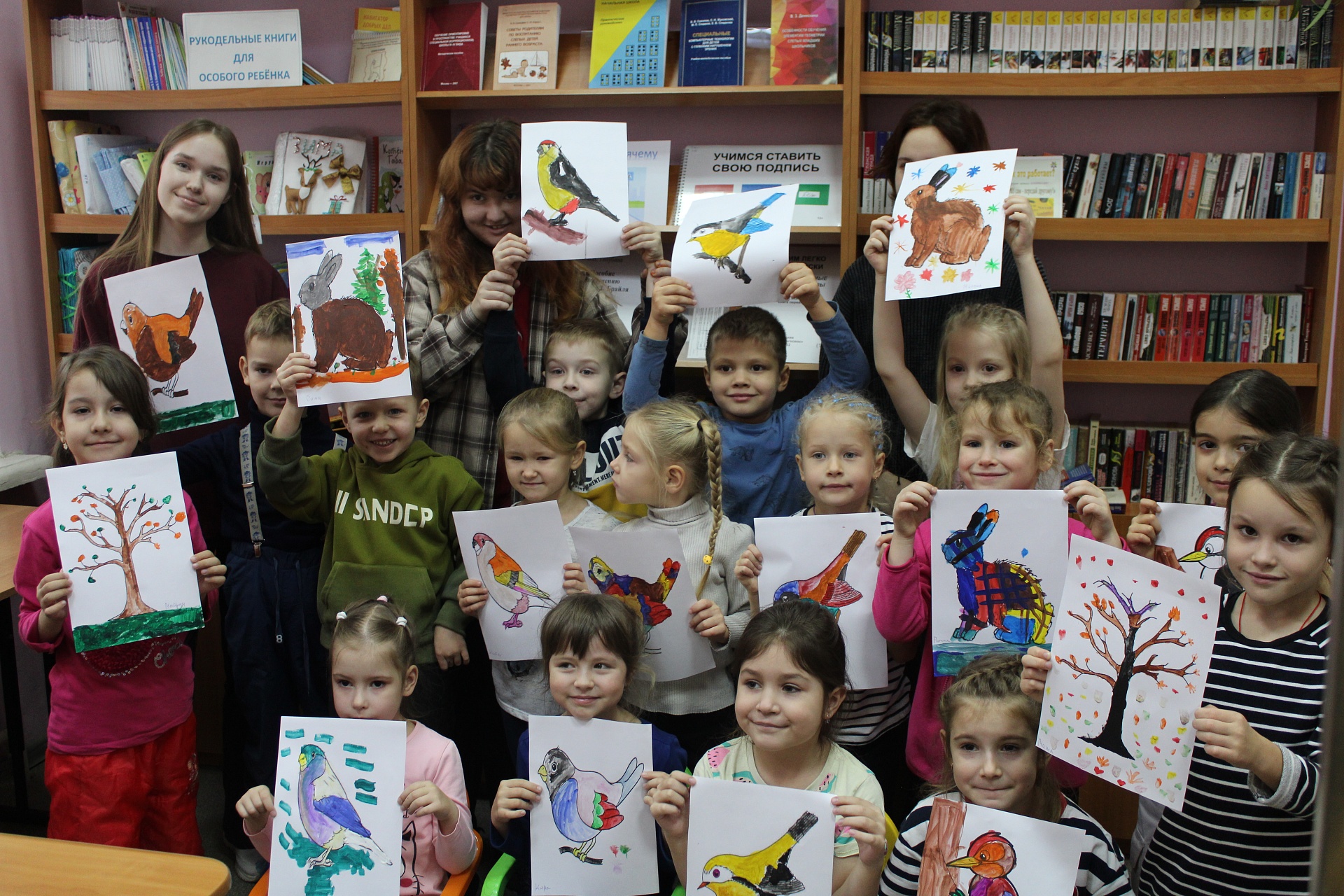 На занятие в Арт-мастерскую «Синяя птица», состоявшееся 7 ноября, впервые пришли воспитанники детского сада общеразвивающего вида № 45. Вначале дети вместе с «Волшебным карандашом» перелистали страницы книжного издания «Синичкин календарь» Благотворительного фонда «Книжки для маленьких слепых детей», знакомясь с содержанием и персонажами этой удивительно доброй сказки Виталия Бианки, прочли страницу ноября-месяца, и, разместившись за мольбертами, приступили к рисованию. Синичка Зинька, старый воробей (литературные герои Бианки) и другие лесные обитатели ожили на детских рисунках. Традиционными наставниками стали студенты Художественного училища им. М.И. Малютина (отряд волонтёров «Передвижники добра»).