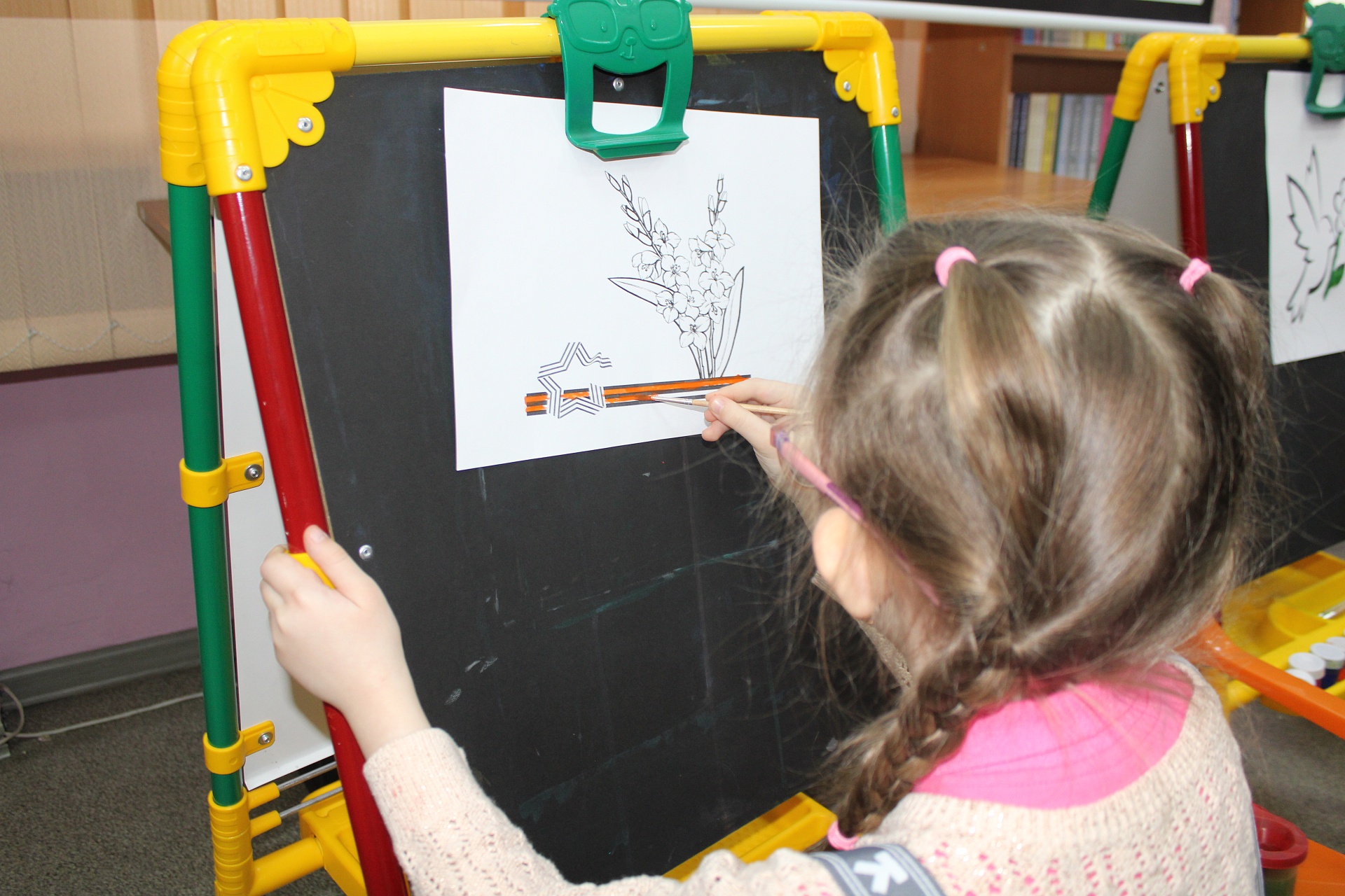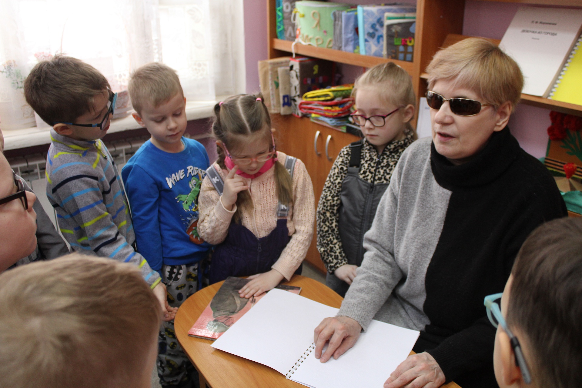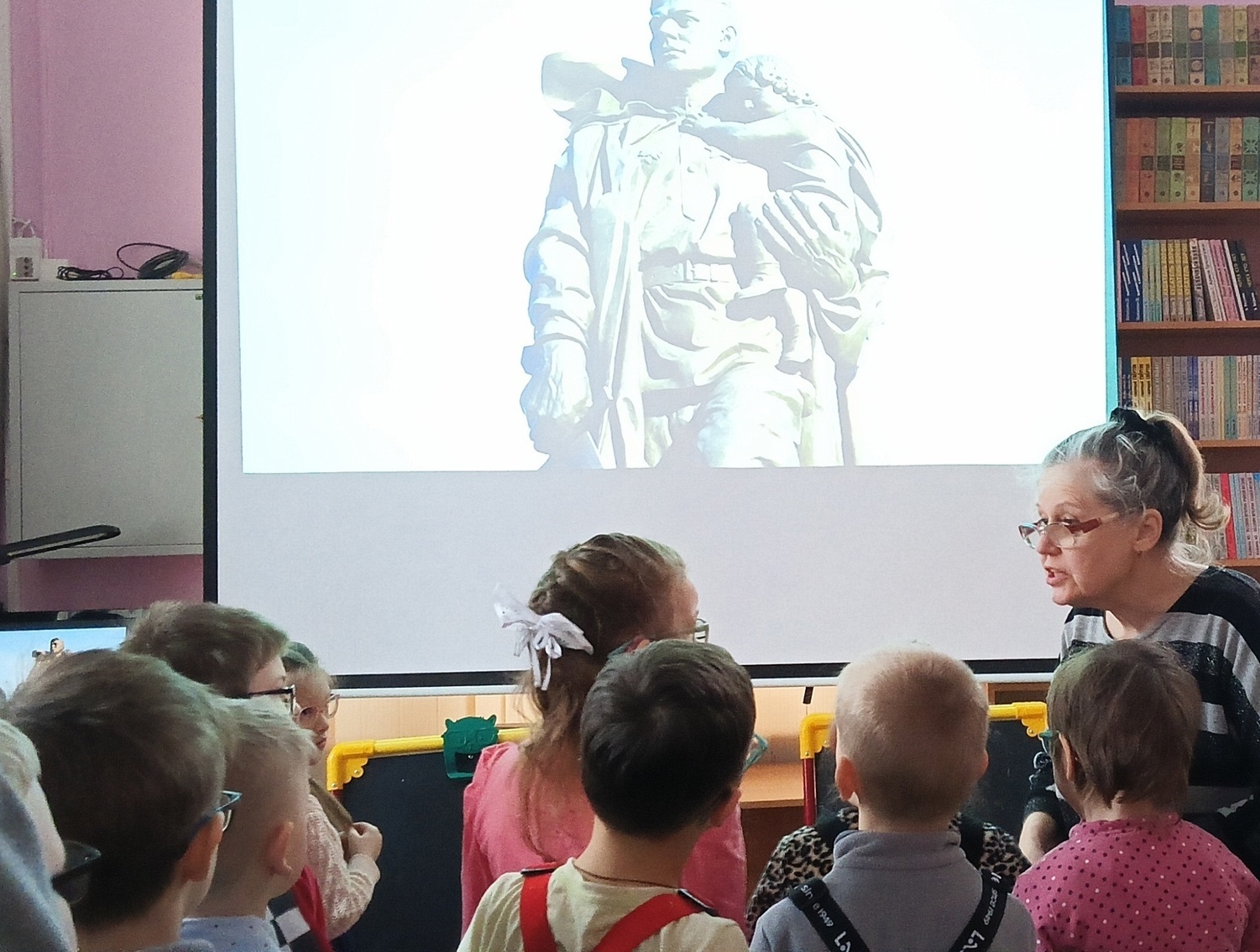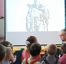 Участники занятия, воспитанники подготовительной группы детского сада компенсирующего вида № 57 встретились с незрячим читателем Ириной Анатольевной Авлиевой, которая прочитала для них шрифтом Брайля рассказ Льва Кассиля «Памятник советскому солдату», основанный на реальной истории спасения миномётчиком Николаем Масловым немецкой девочки из огня на одной из улиц Берлина в апреле 1945 года. Дети внимательно слушали рассказ, посмотрели изображение памятника «Воин-освободитель», поставленного в столице Германии в память об этом герое, ответили на вопросы и приступили к рисованию. Старательно трудились над изображением вечного огня, георгиевской ленточки, красной звезды, самолетов, праздничных салютов – в этом им помогали Александрова Анна и Кустова Александра, студенты 1 курса Художественного училища им. М. И. Малютина (отряд волонтёров «Передвижники добра»)