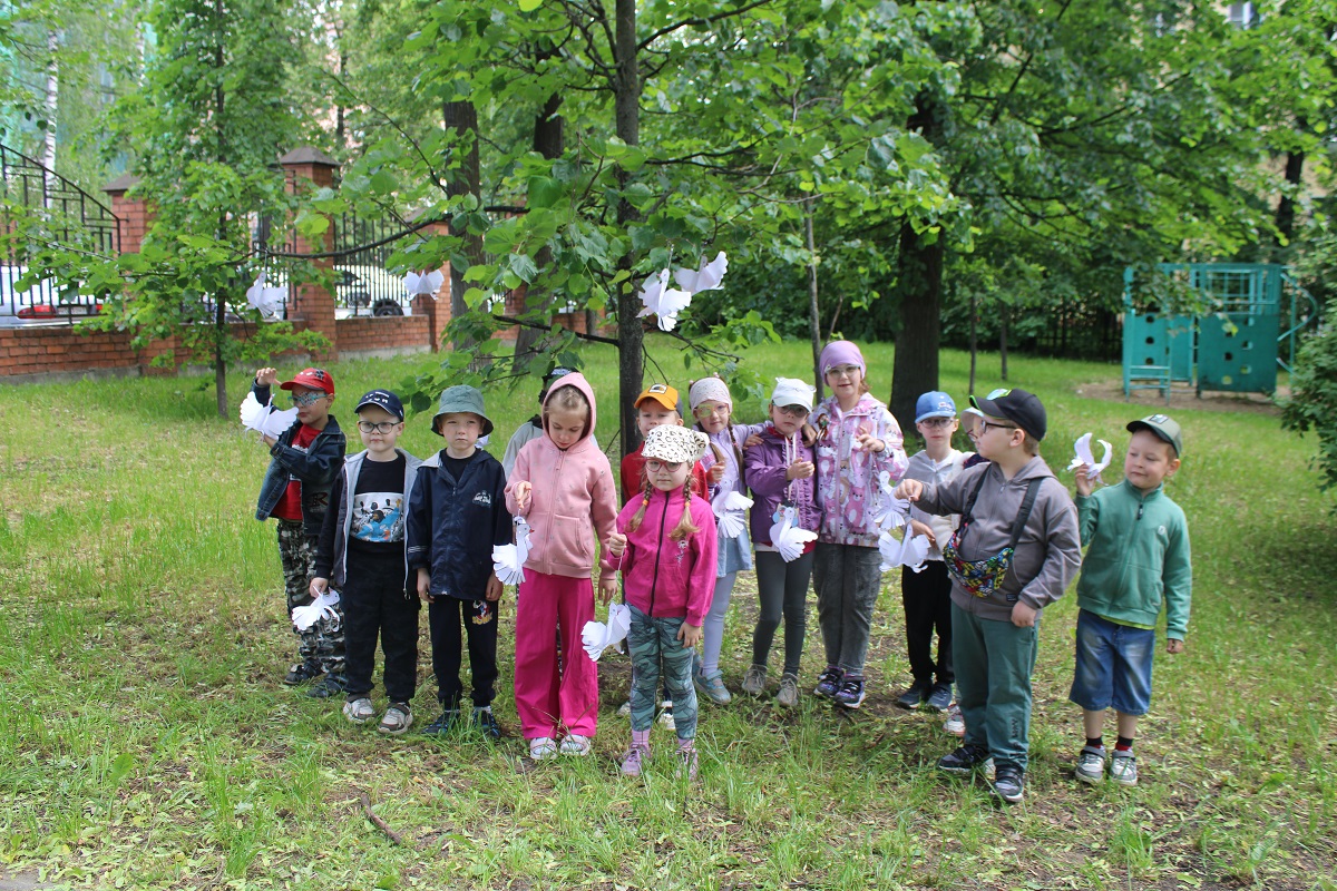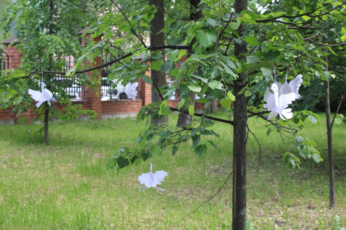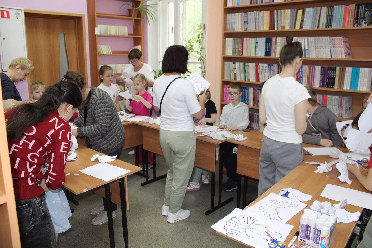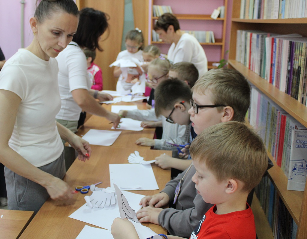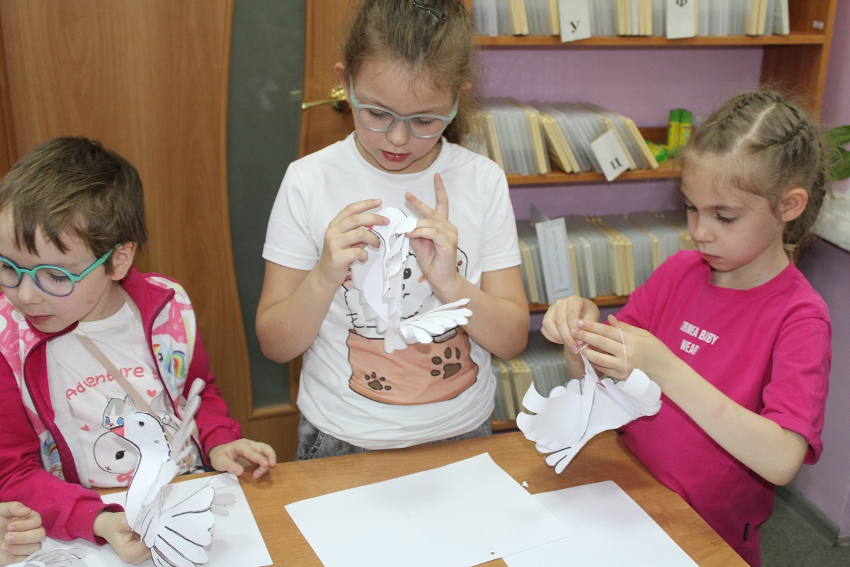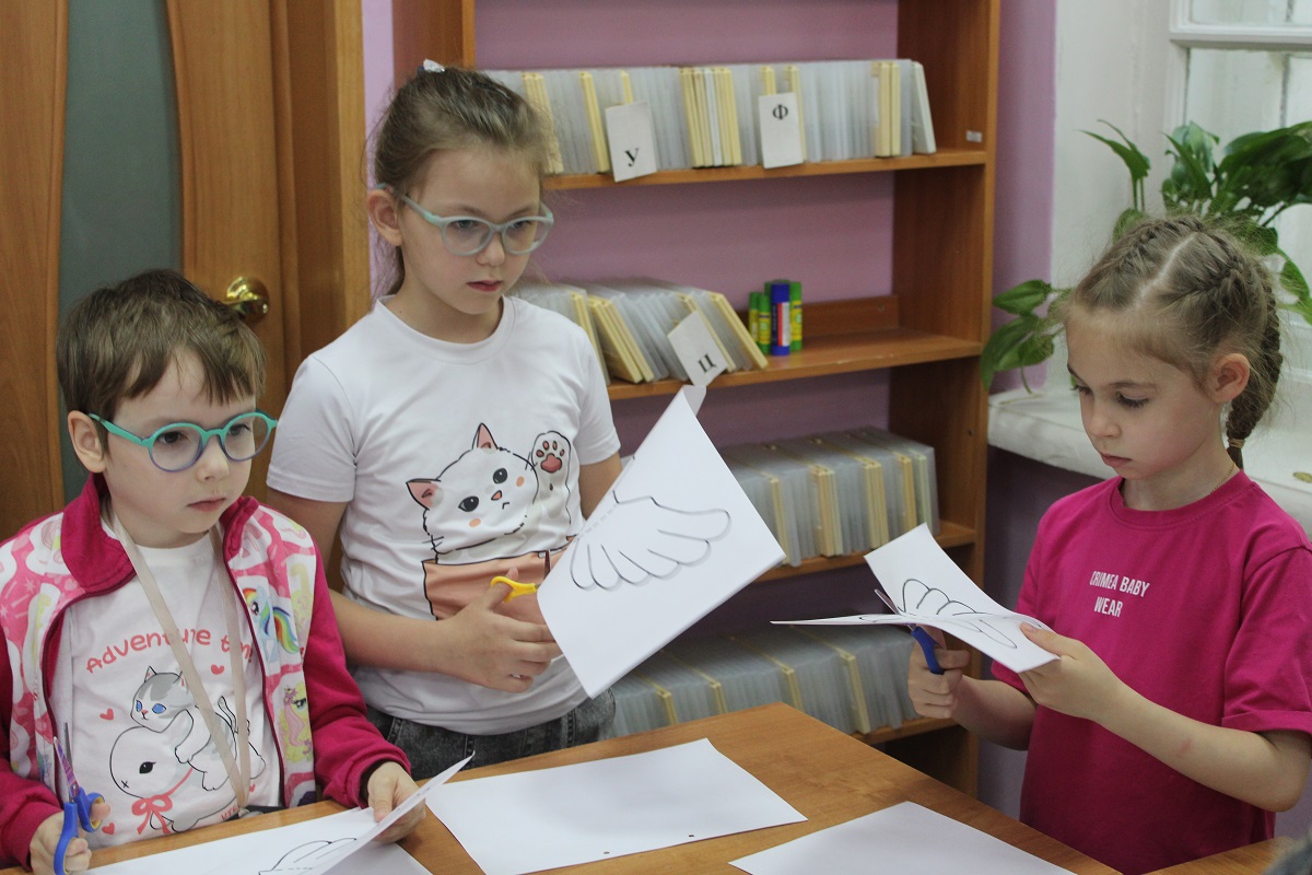 Светлана Георгиевна Ерёмина, руководитель Тинейджер-центра Ивановского Дворца детского творчества, провела мастер-класс по изготовлению бумажных фигурок голубя, подробно объясняя все этапы работы. Дети сосредоточенно трудились: вырезали фигурки птиц, сгибали и склеивали детали, рисовали, привязывали ниточки, чтобы голуби могли парить на свежем воздухе, как живые. Педагоги детского сада и сотрудники библиотеки также были увлечены творческим процессом, по необходимости помогая ребятам. Занятие завершилось в Литературном сквере, и часть голубиной стаи оказалась на ветвях ивы, остальные – «полетели» с ребятами в детский сад.
