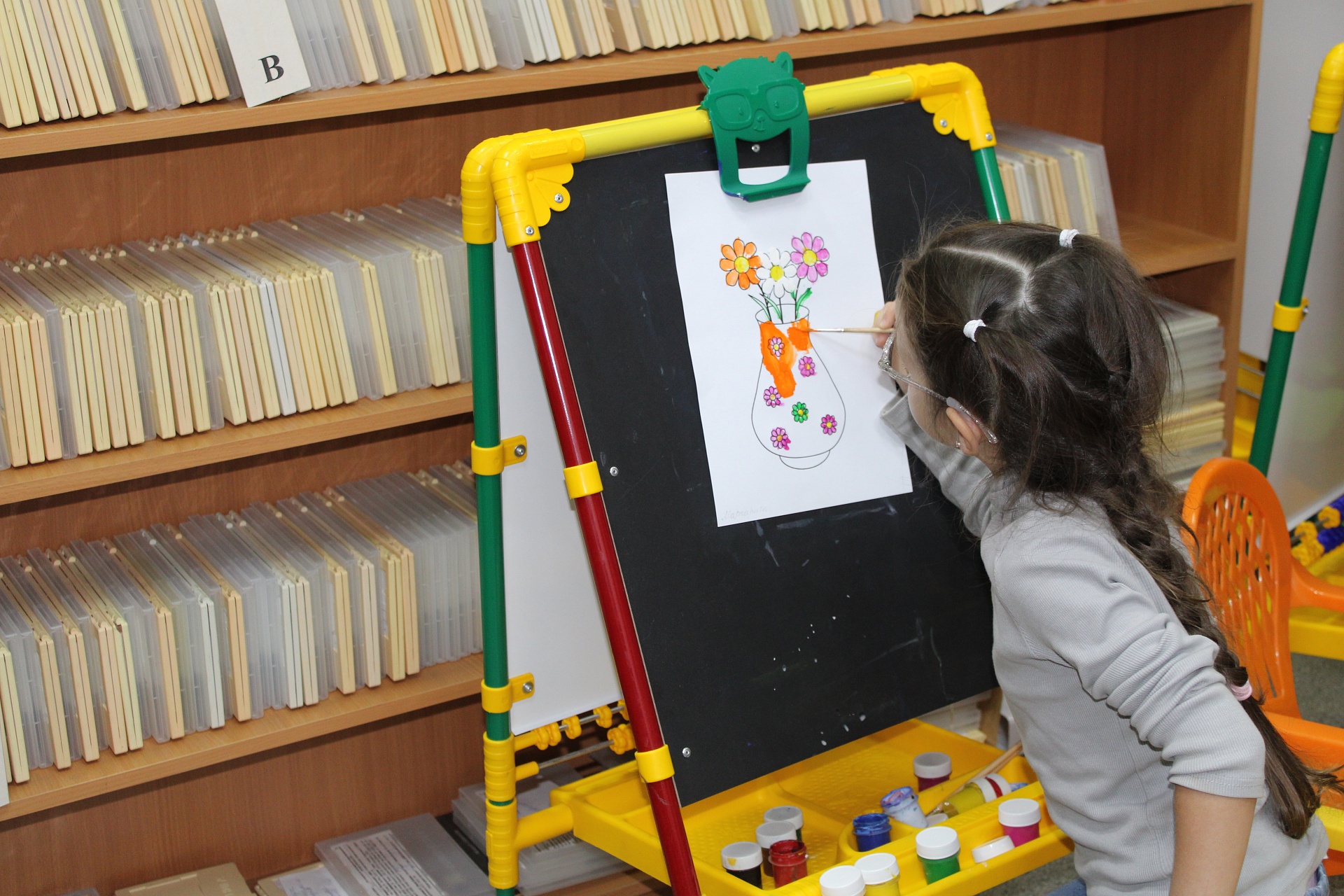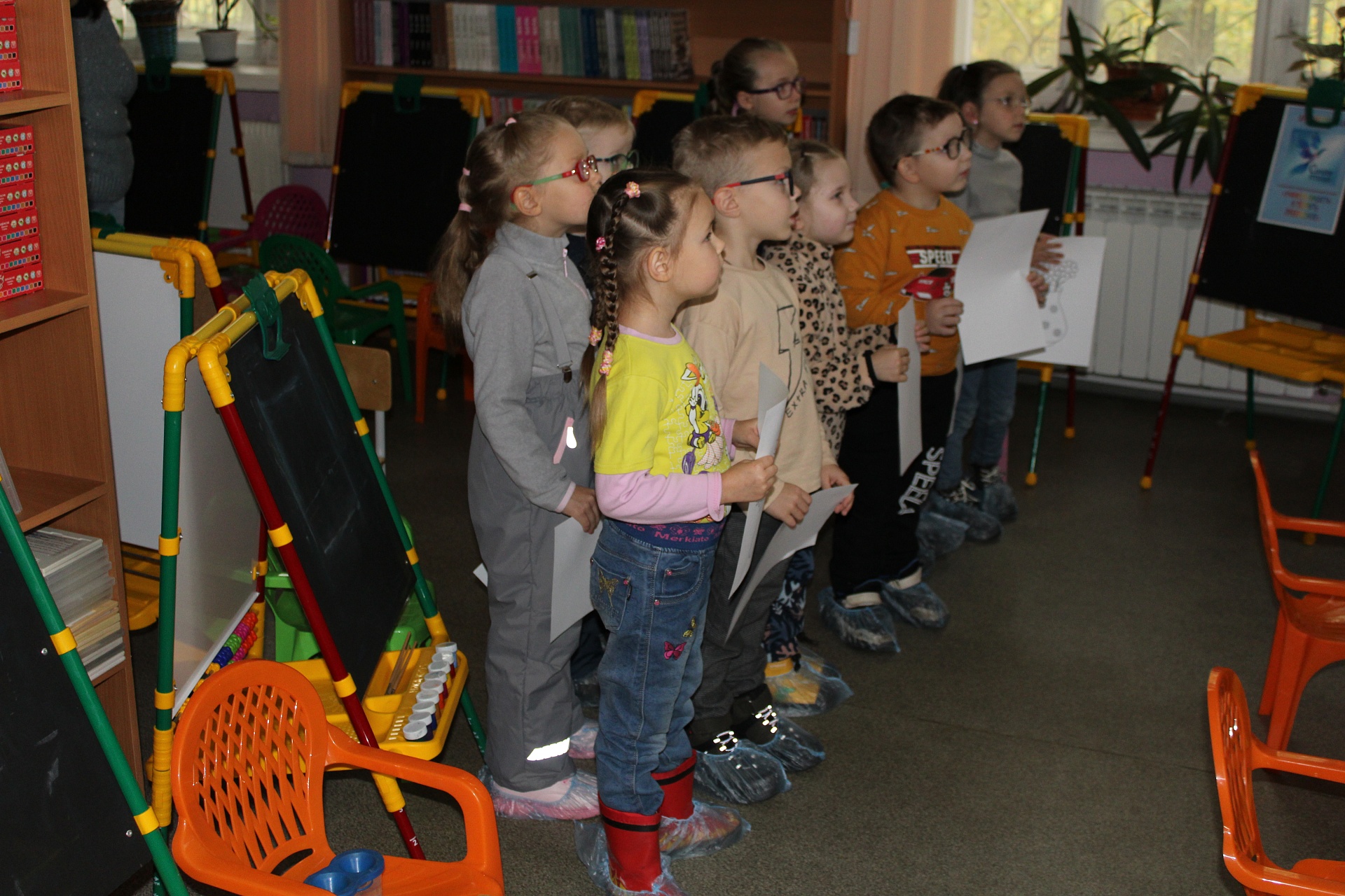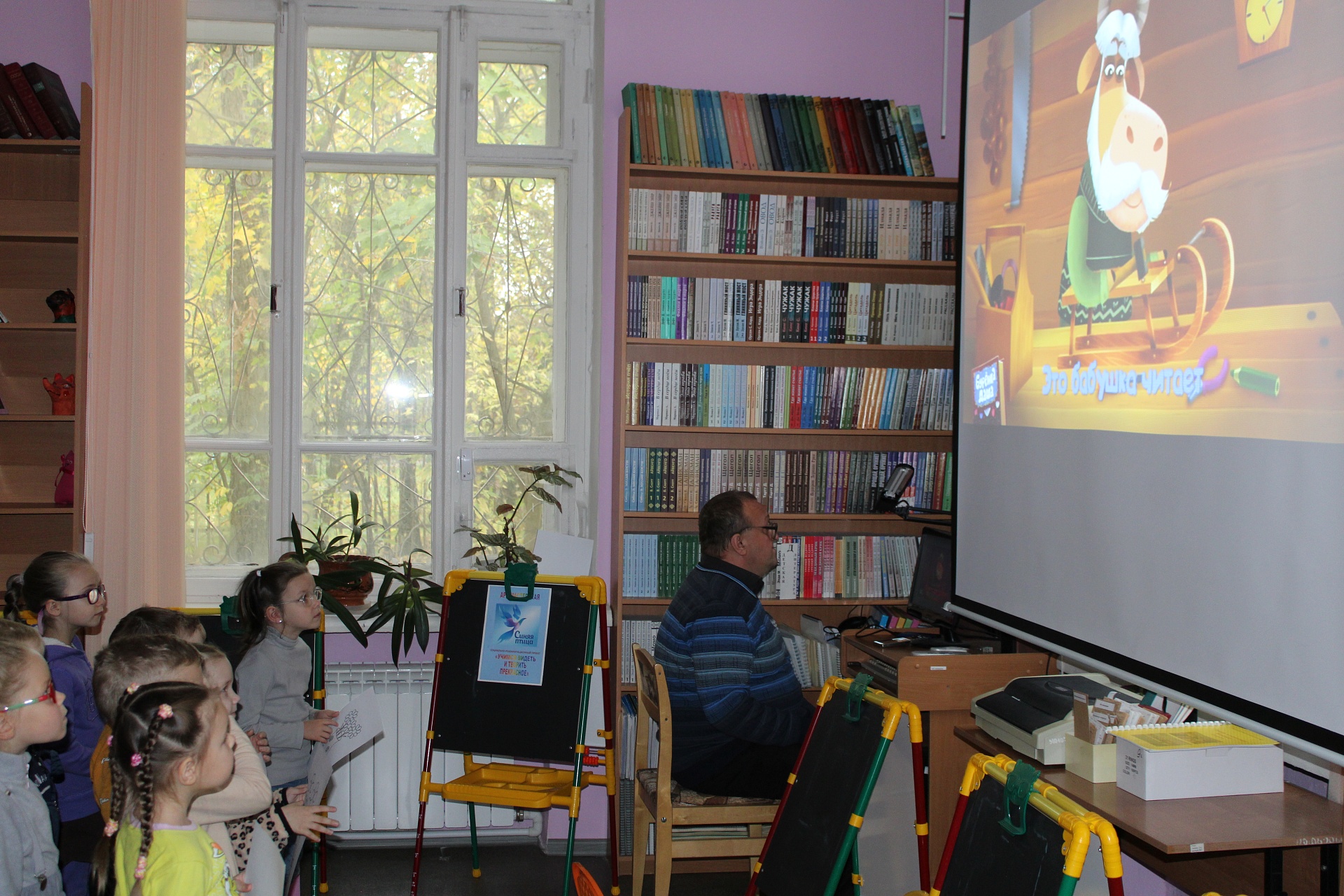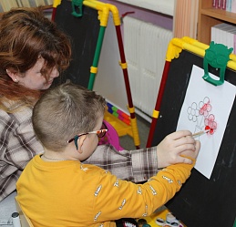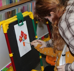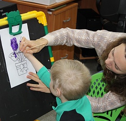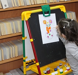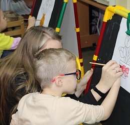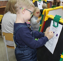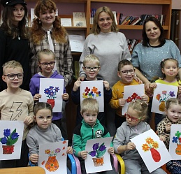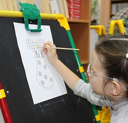 Очередное мероприятие Месячника Белой трости состоялось 10 октября: на занятие в Арт-мастерскую «Синяя птица» пришли воспитанники старшей группы детского сада компенсирующего вида № 57. Прежде, чем разместиться у мольбертов, юные художники определились с выбором будущего рисунка – им предстояло раскрасить вазы с цветами в качестве подарка старшим членам семьи – бабушкам и дедушкам. Но сначала посмотрели весёлый мультфильм с детской развивающей песенкой «Бабушки и дедушки» Бурёнки Даши.