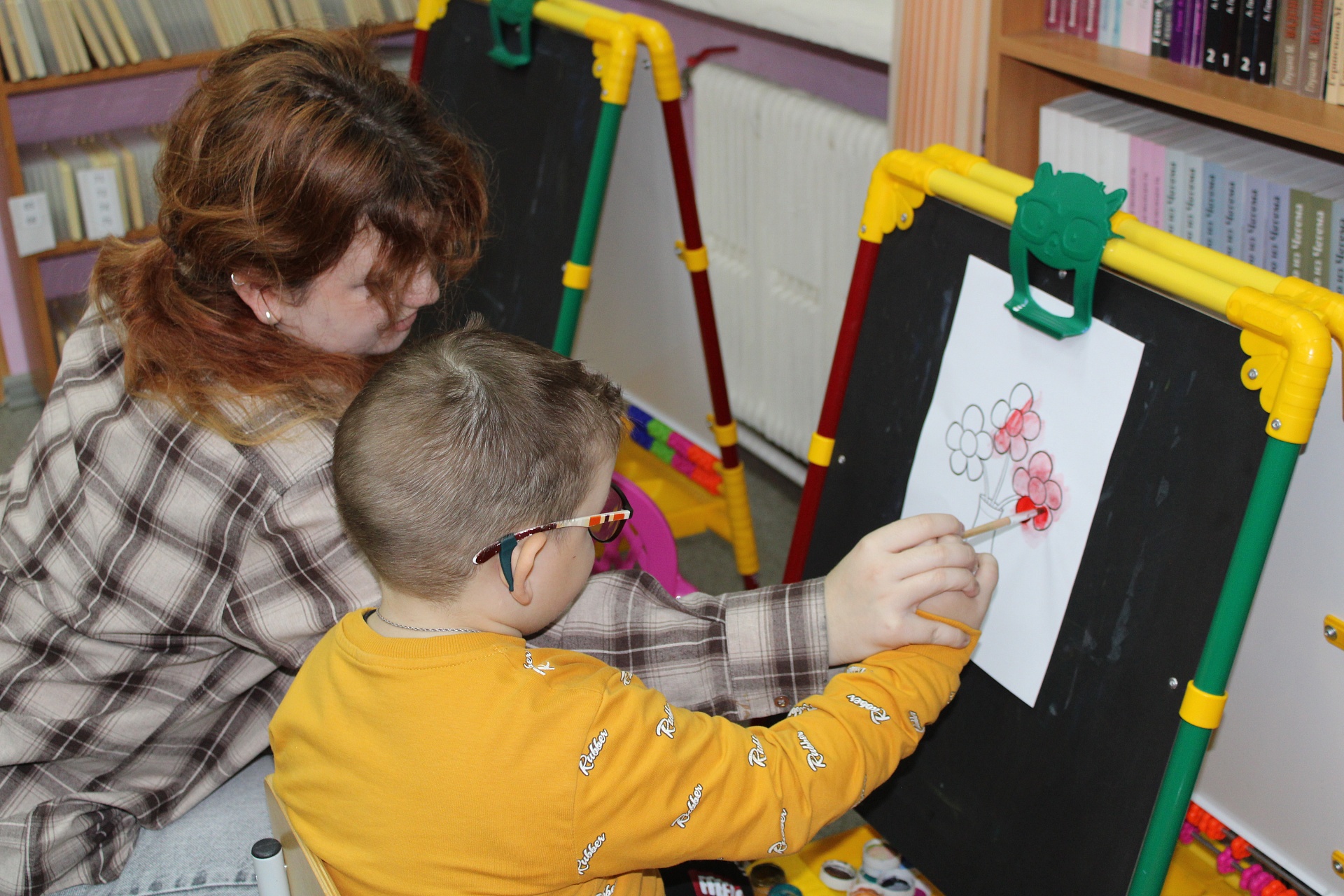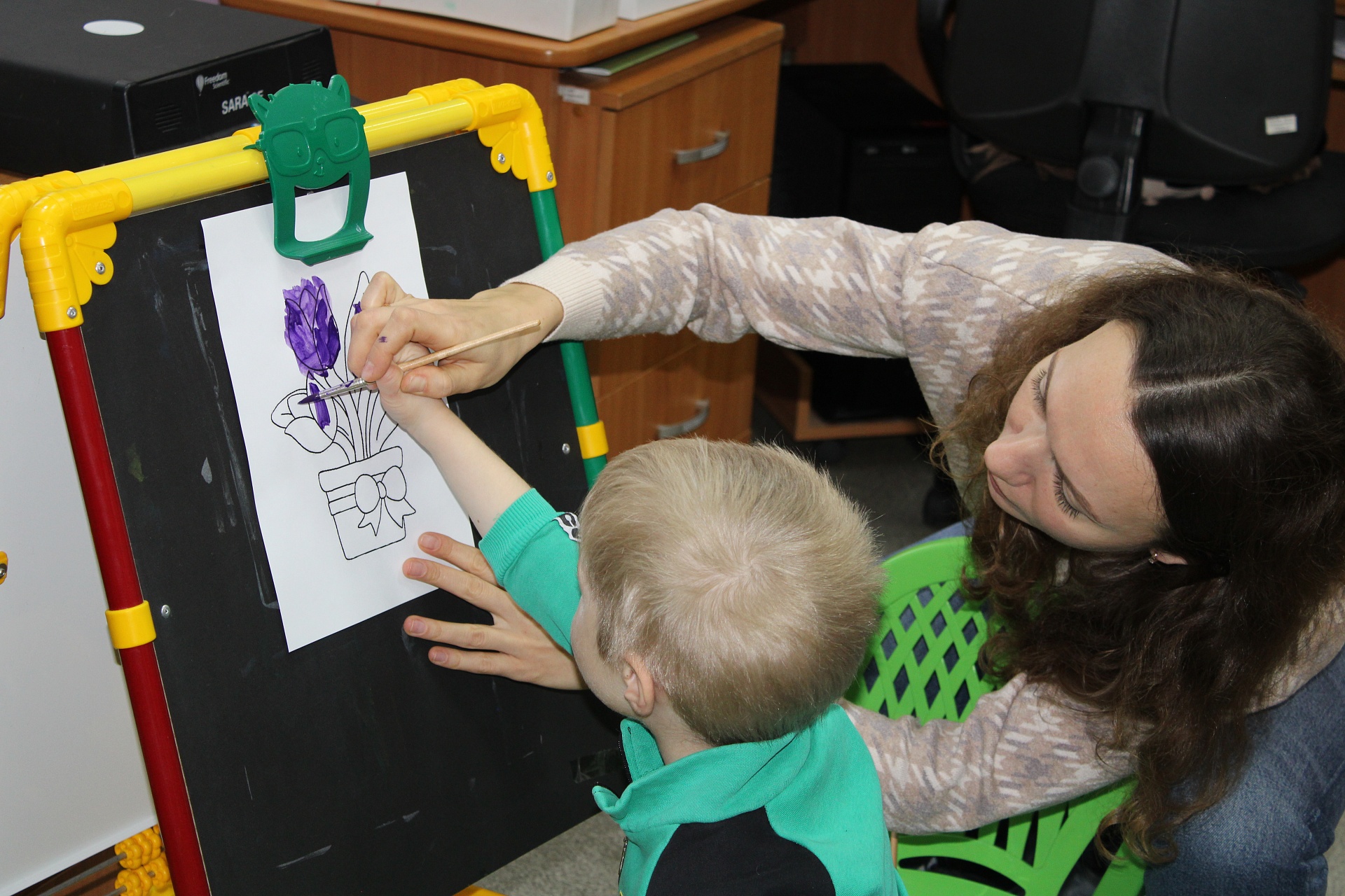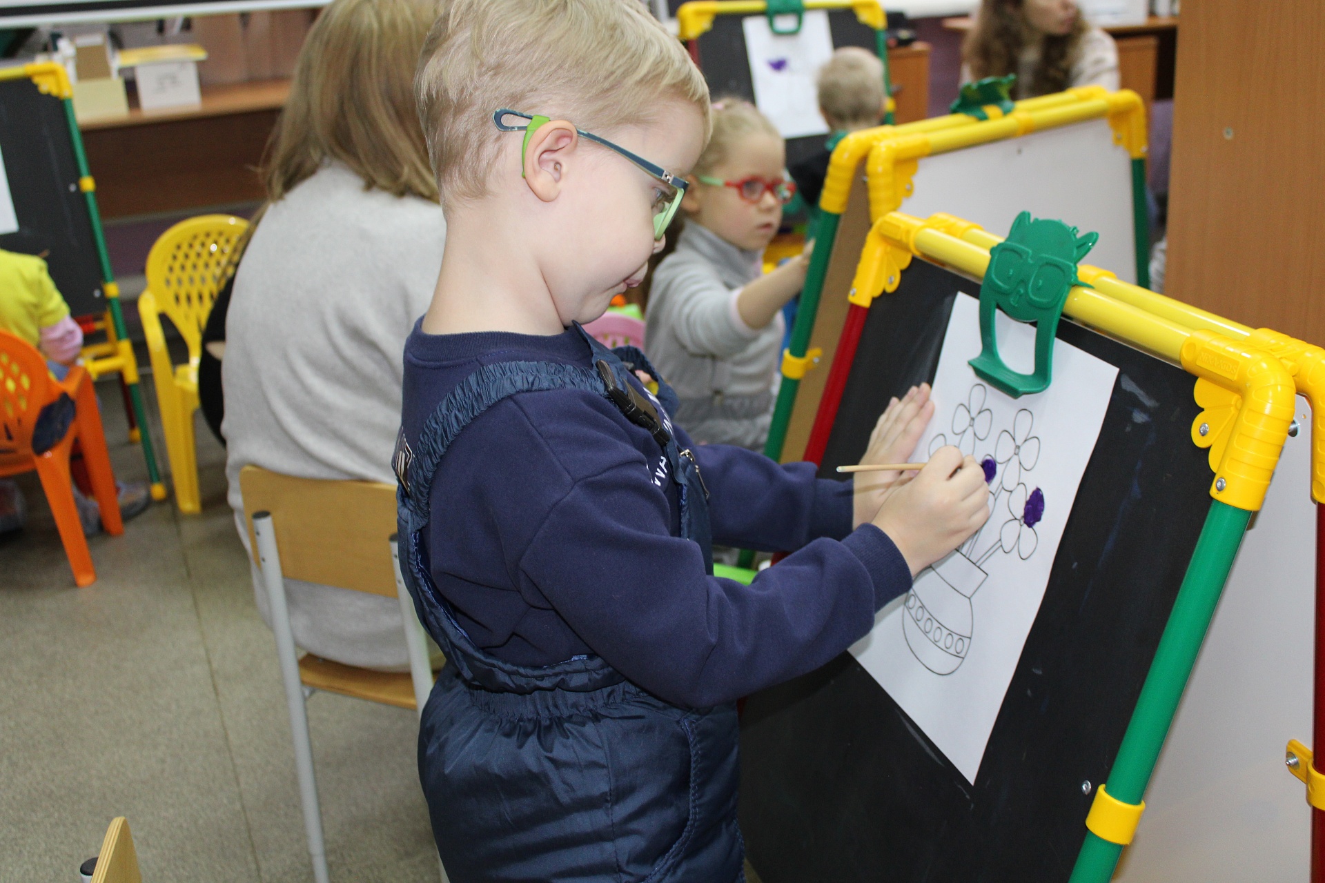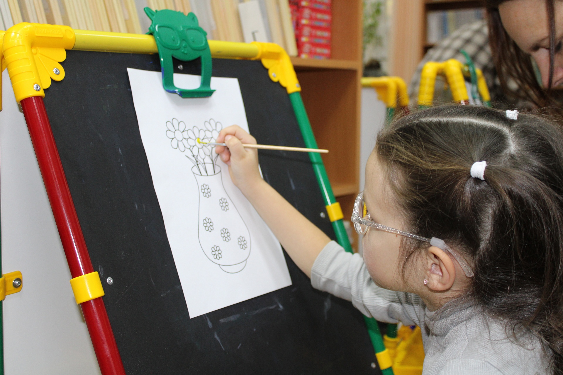 Очередное мероприятие Месячника Белой трости состоялось 10 октября: на занятие в Арт-мастерскую «Синяя птица» пришли воспитанники старшей группы детского сада компенсирующего вида № 57. Прежде, чем разместиться у мольбертов, юные художники определились с выбором будущего рисунка – им предстояло раскрасить вазы с цветами в качестве подарка старшим членам семьи – бабушкам и дедушкам. Но сначала посмотрели весёлый мультфильм с детской развивающей песенкой «Бабушки и дедушки» Бурёнки Даши.
