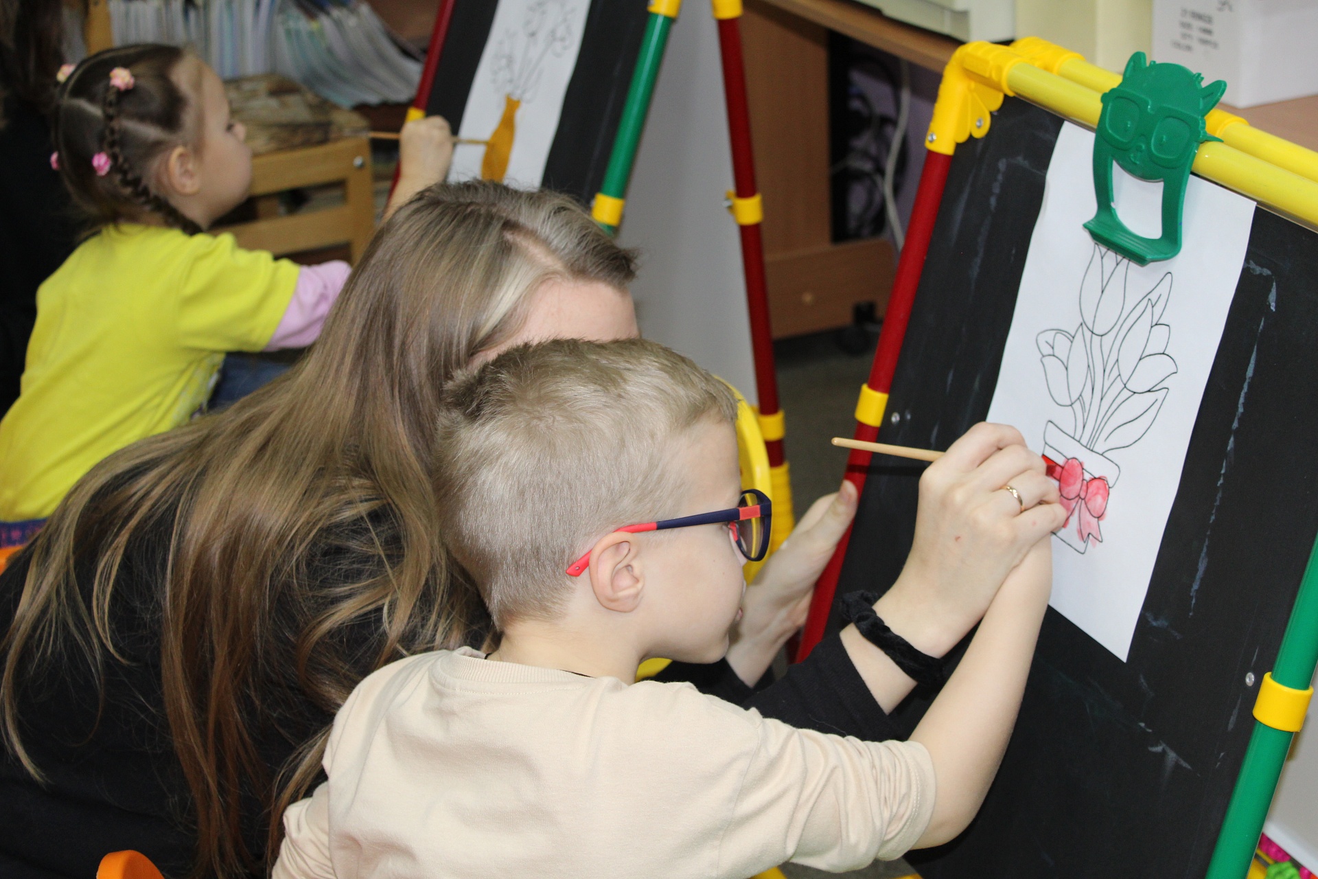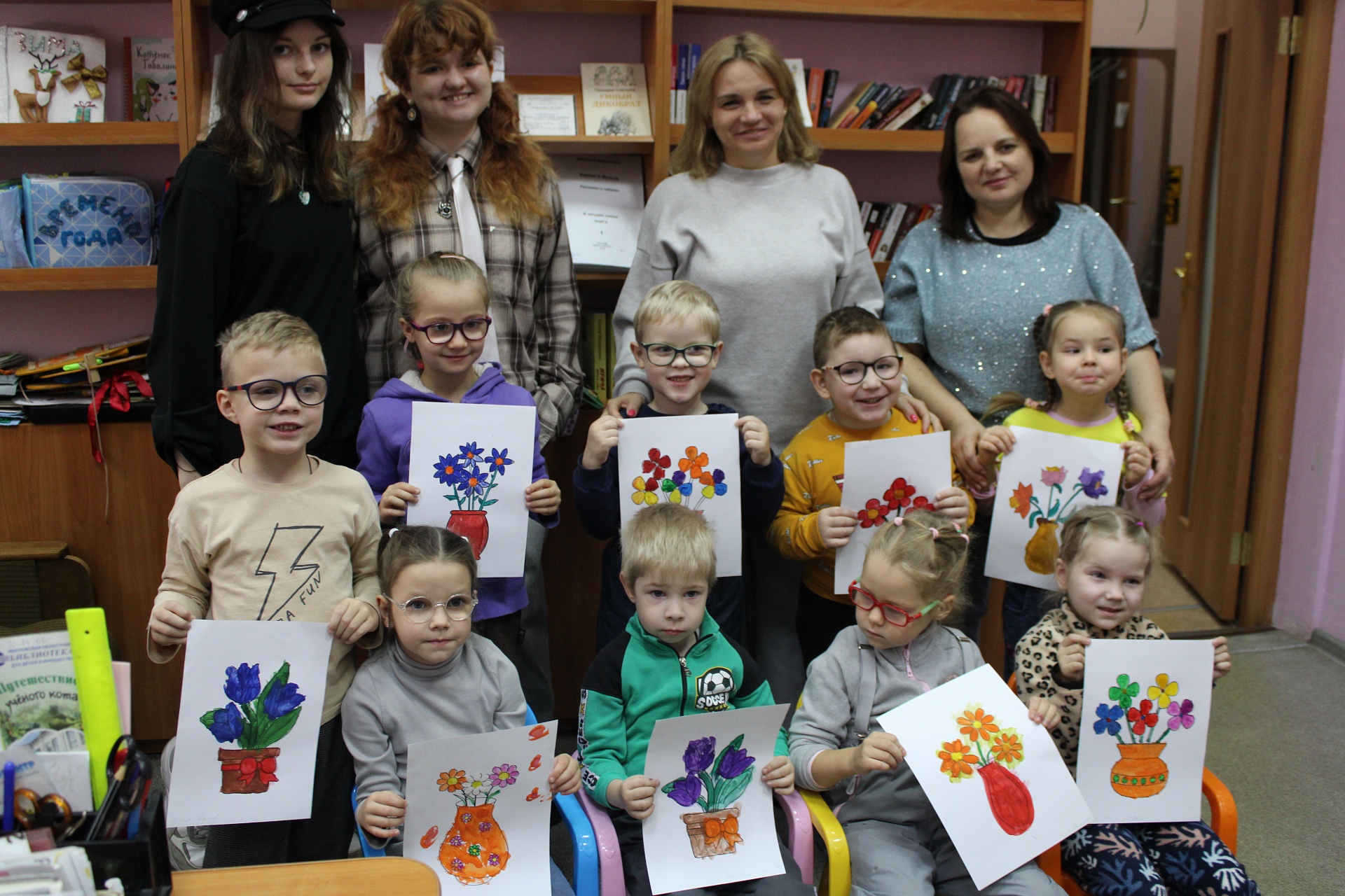 Дети трудились самозабвенно, очень старались, самостоятельно подбирали цвета для букетов; по традиции помогали наставники – студенты Художественного училища им. М.И. Малютина (отряд волонтёров «Передвижники добра»).