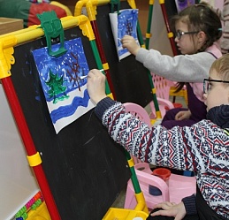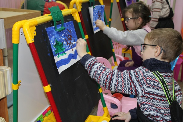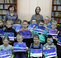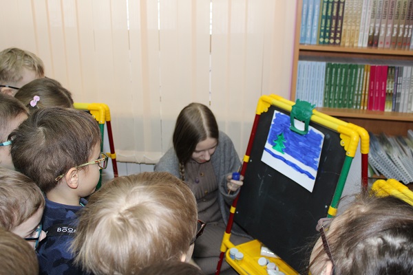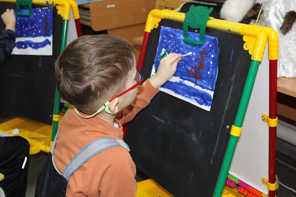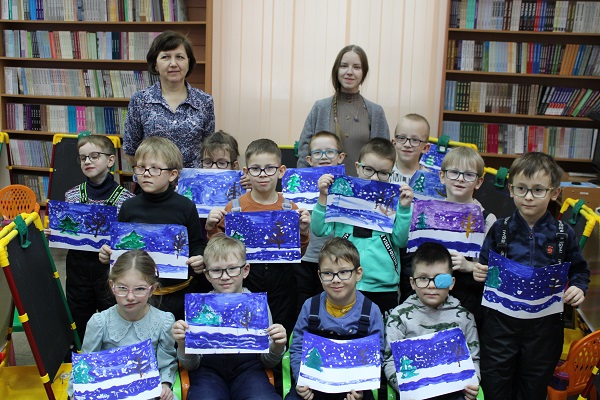 Арт-мастерскую «Синяя птица» 12 февраля посетили воспитанники подготовительной группы детского сада компенсирующего вида г. Иваново №146. Прежде, чем разместиться за мольбертами, дети разгадывали загадки о зимнем времени года читающей машины «SARA», прочитали стихи о зиме. Полина Коптелова, студентка 4 курса Ивановского художественного училища имени М. И. Малютина (отряд волонтёров «Передвижники добра») предложила юным художникам изобразить на своих рисунках зимний пейзаж, подробно объясняя и показывая каждый этап предстоящей работы. Изображая на своих рисунках зимний лес, дети очень старались передать волшебный мир снежной ночи, которая у каждого получилась особенная и неповторимая.