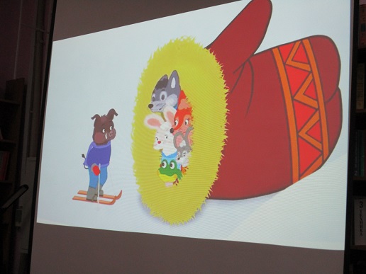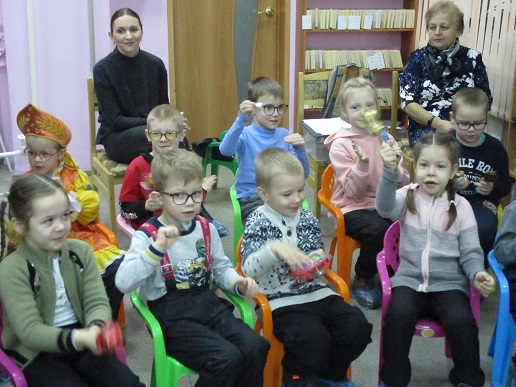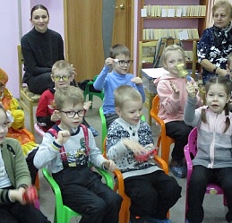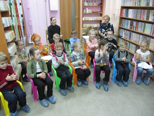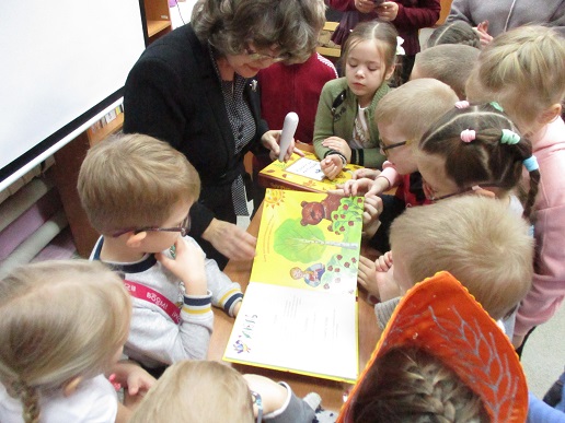 Гостей встречал библиотечный Учёный Кот Мурлыка, предложив прочитать некоторые страницы необыкновенной книги с помощью удивительного, звучащего «волшебного карандаша»: ею оказался «Синичкин календарь» Виталия Бианки, изданный Благотворительным фондом «Книжки для маленьких слепых детей». Дошкольники с синичкой Зинькой и её другом, старым воробьём, отправились в путешествие по зимним месяцам, вспомнили времена года. Дети активно отвечали на вопросы онлайн-викторины «Зимние забавы», подготовленной нашими друзьями – коллегами Библиотеки-филиала 27 ЦБС детских библиотек г. Иваново. Читающая машина SARA озвучила юным читателям стихотворные загадки об осени. Этому времени года были посвящены и стихотворения, и небольшой музыкальный номер «Прощай, золотая осень» в исполнении детей: бубны, деревянные ложки, колокольчики в их руках прозвучали задорно и весело. В окончании библиоурока ребята посмотрели мультипликационный фильм по рассказу Евгения Чарушина «Рукавичка» и пообещали заботиться о птицах в тяжёлое для пернатых зимнее время года.