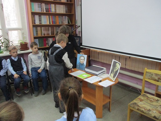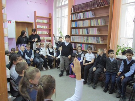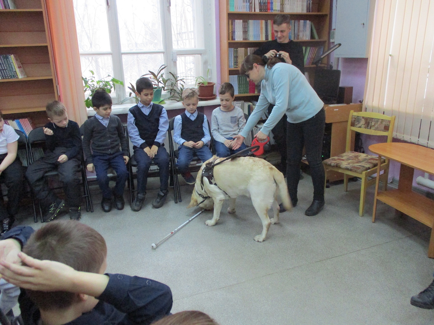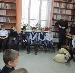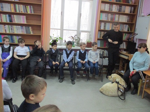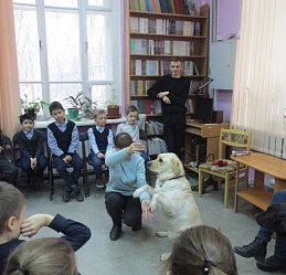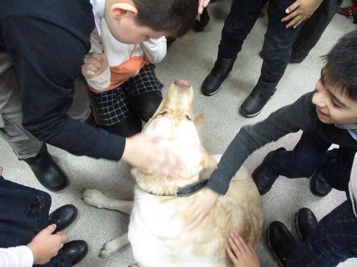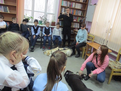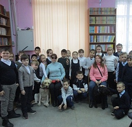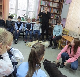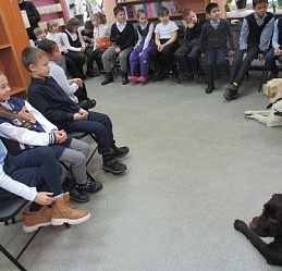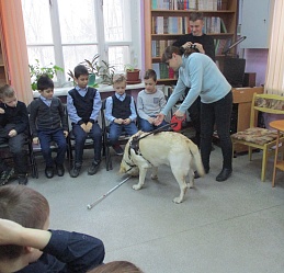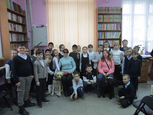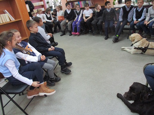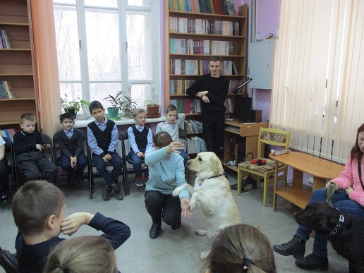 Очередное мероприятие акции – Библиотечный урок «Вот это друг! С ним все пути открыты» состоялось в библиотеке 27 октября. Участниками урока вновь стали учащиеся 2-а класса средней общеобразовательной школы № 58 (г. Иваново). Вначале вспомнили о том, что узнали школьники на первом уроке «День открытых дверей», состоявшемся 12 октября с участием незрячих читателей Тони Сахаровой и А.В. Назаретским: какие помощники есть в получении образования незрячими детьми, а также в быту, профессиональной деятельности незрячего человека. После фрагмента документального фильма «Ко мне, Таби!» о незрячем читателе библиотеки Дмитрии Зарипове и его собаке-поводыре Таби из библиотечного архива, дети с воодушевлением восприняли предложение встретиться наяву с владельцами собак-проводников и их четвероногими помощниками. С неподдельным удивлением встретили. появление Светланы Каретиной, руководителя клуба владельцев собак-проводников «Вектор» с лабрадором Флаем, и Елены Чикиной с лабрадором Рокси.