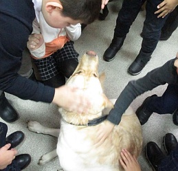 В завершении дети получили домашнее задание (разукрасить предложенные изображения по теме урока), окружили четвероногих гостей, ласково с ними общались и с огромным удовольствием вместе сфотографировались.