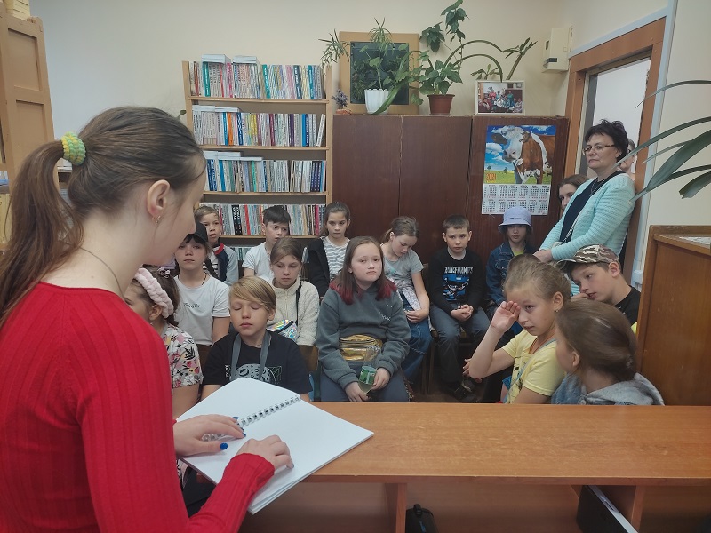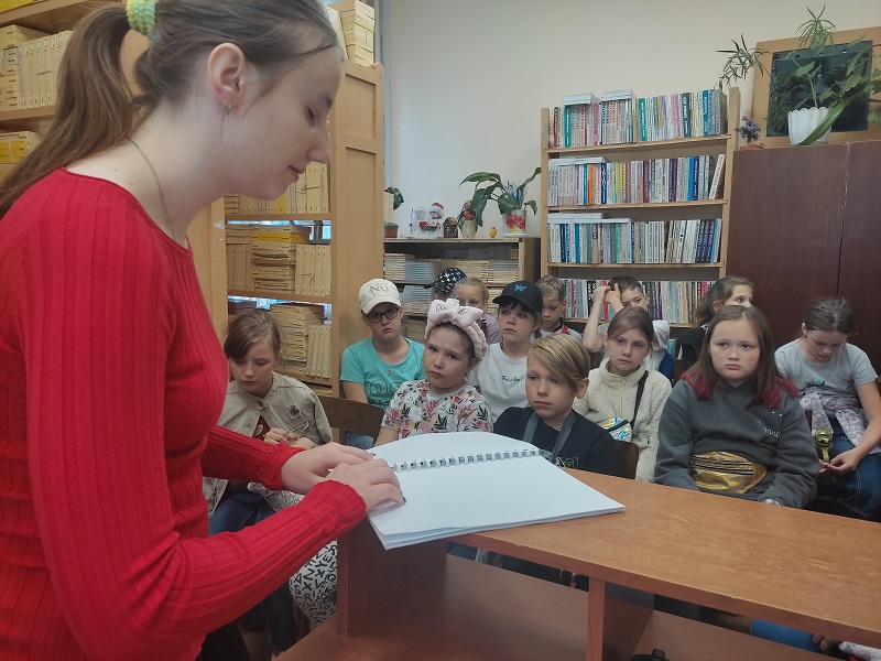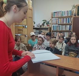 Интерес у ребят вызвала повесть о котёнке Габалино незрячей 11-летней читательницы Ивановской областной библиотеки для слепых Антонины Сахаровой, изданной рельефно-точечным и укрупненным шрифтом. Олеся наглядно показала технику чтения по брайлю одной из глав повести.