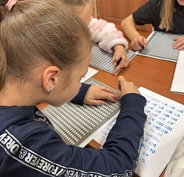 Им был продемонстрирован специальный письменный прибор, тетради и блокноты для письма по Брайлю. Ребята самостоятельно попробовали грифелем написать буквы из комбинаций шеститочия.