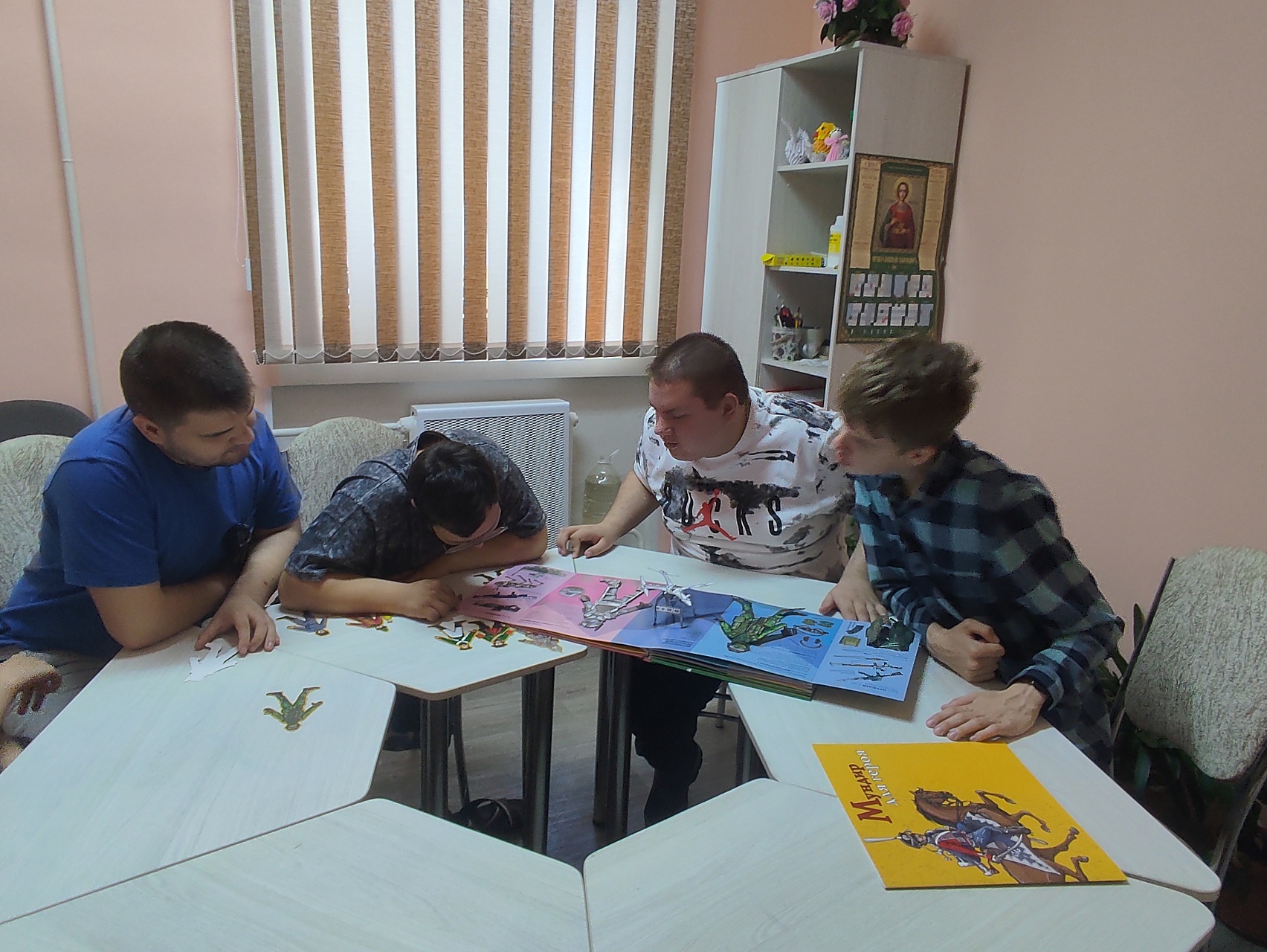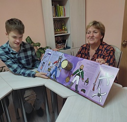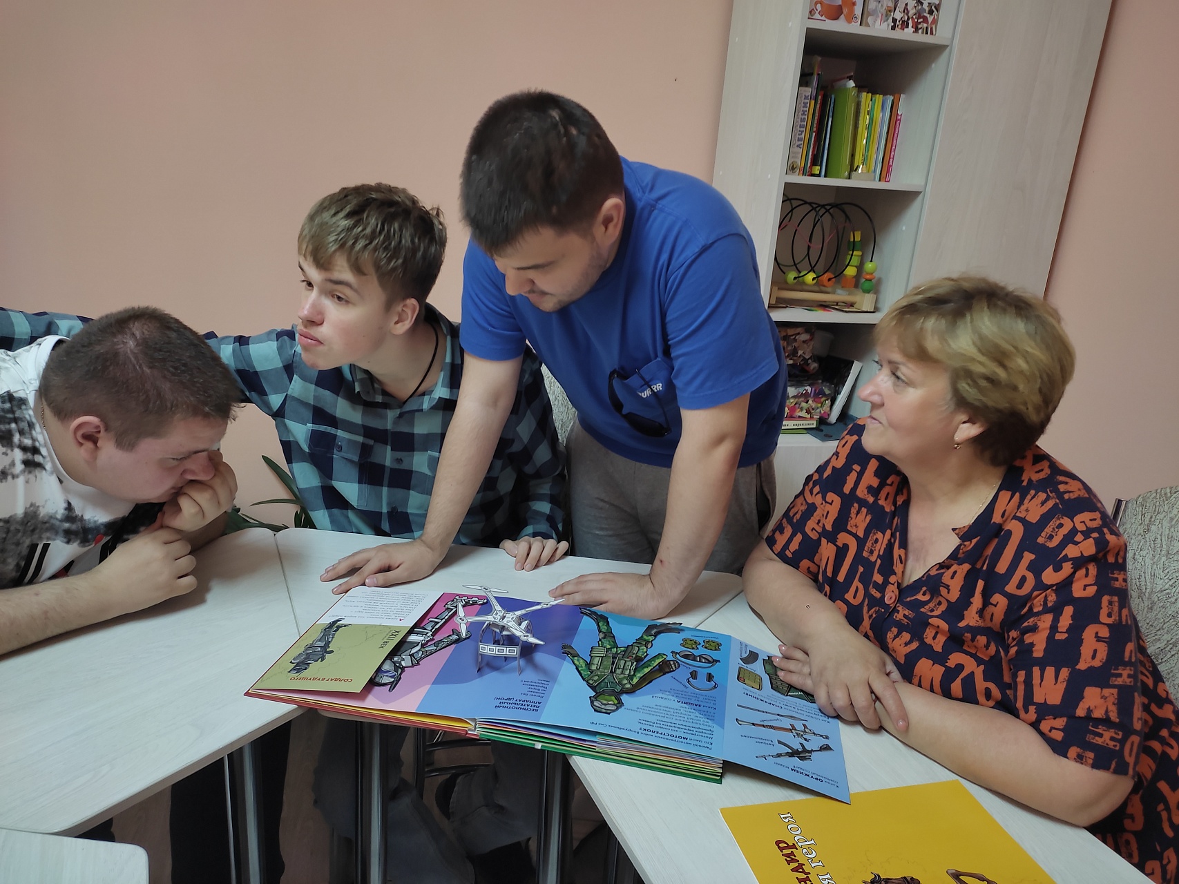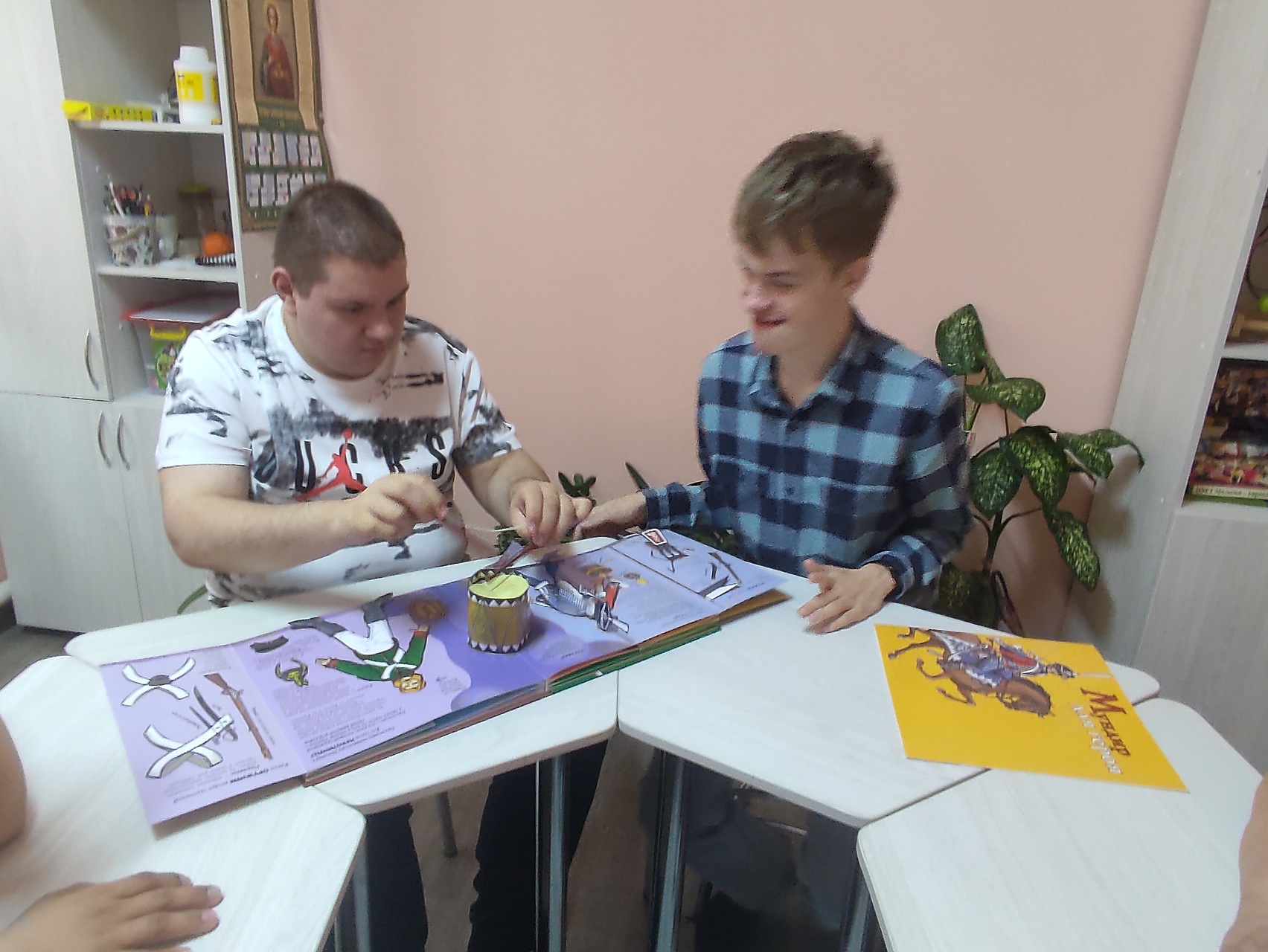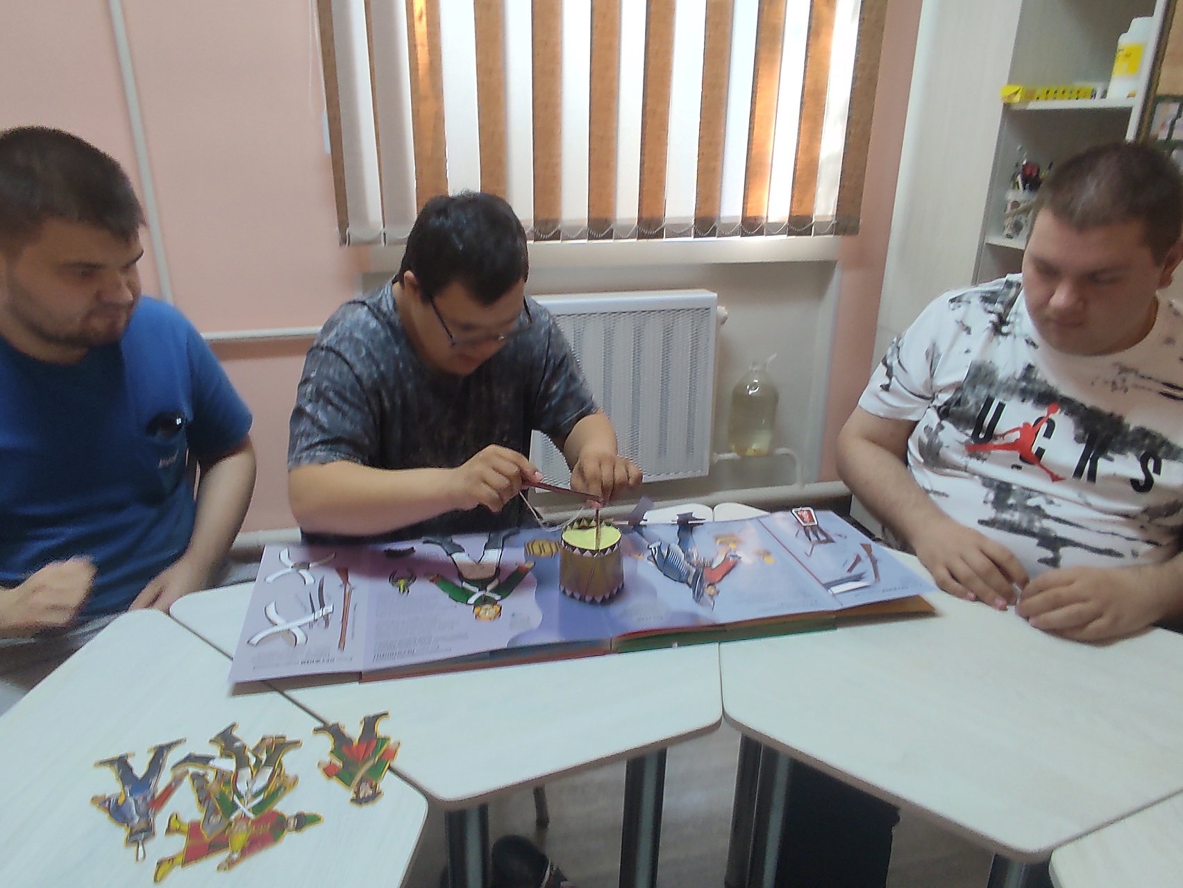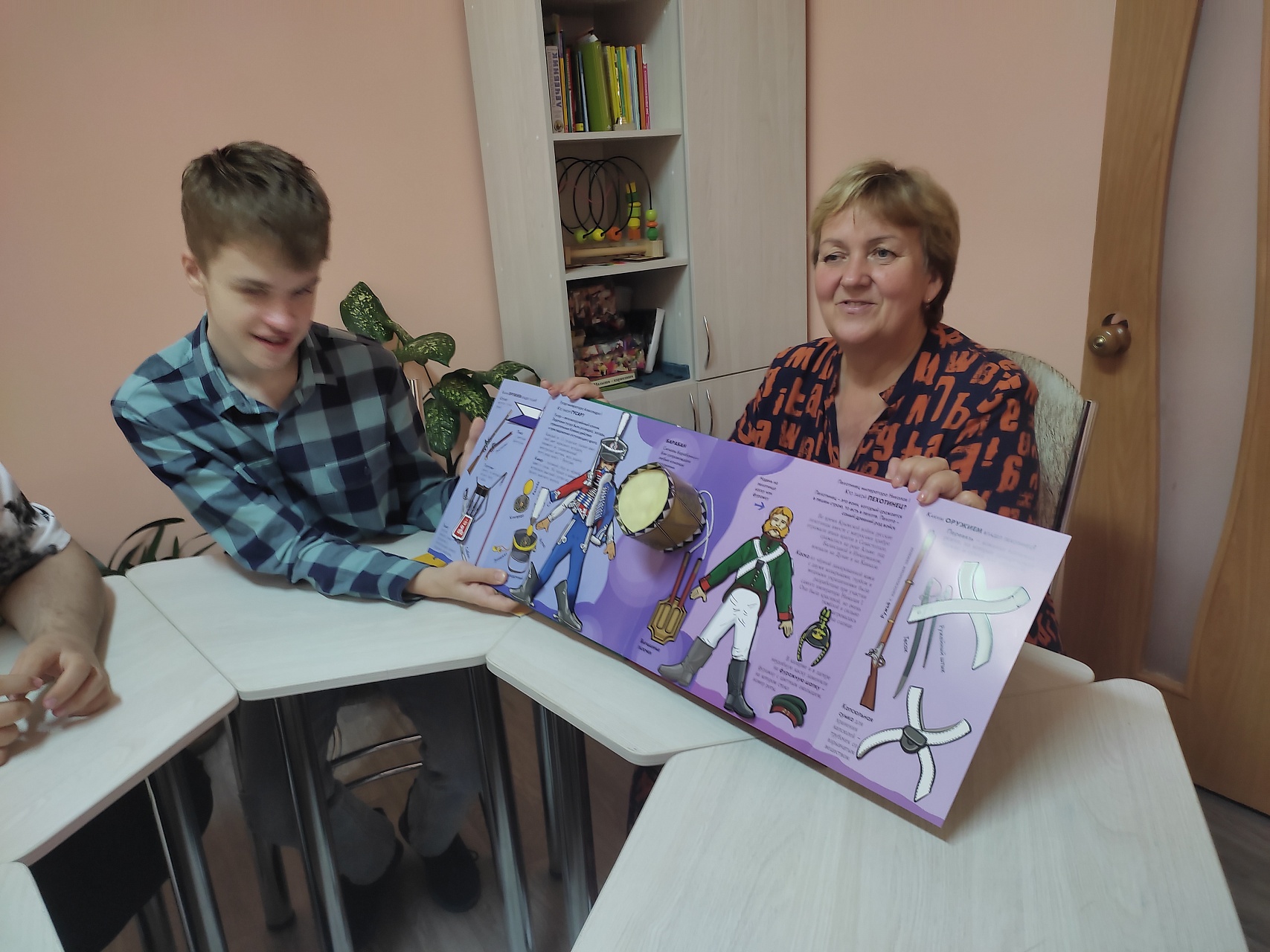 В ходе занятия ребята погрузились в увлекательный мир истории России и её вооруженных сил благодаря ярким контрастным иллюстрациям, подвижным и объёмным конструкциям и тактильным элементам книги-экскурсии «Мундир для героя», изданной Благотворительным фондом «Иллюстрированные книжки для маленьких слепых детей» при поддержке Фонда Президентских Грантов.