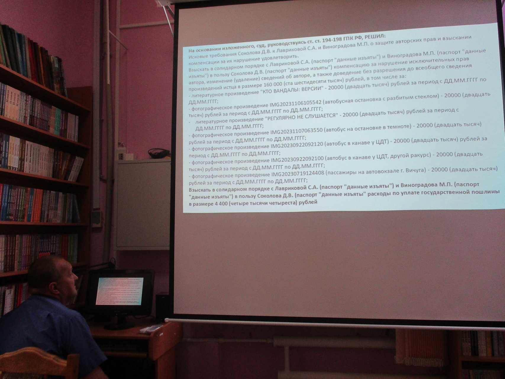 В библиотеке 9 июля для несовершеннолетних и взрослых читателей в целях правового просвещения граждан и безопасности поведения ребёнка в информационном пространстве состоялся Час правовой информации «Всем полезен, спору нет, безопасный Интернет». Незрячий юрист Дмитрий Римович Зарипов, эксперт Дворца искусств, в содержательном, проиллюстрированном примерами сообщении, обстоятельно рассказал об основах авторских и смежных прав, о легальной монополии в сфере интеллектуальной собственности и о распространённых случаях нарушения авторских прав и возможных последствиях. Особенно ценной эта информация является для несовершеннолетних детей, которые достаточно много времени проводят в сети интернет. Ознакомиться с аудиозаписью информационного сообщения Д.Р. Зарипова можно по ссылке: