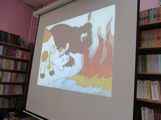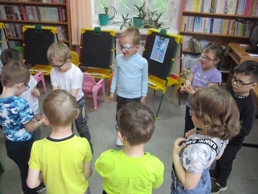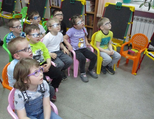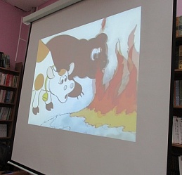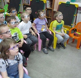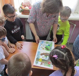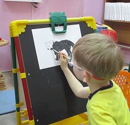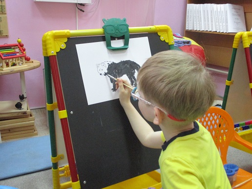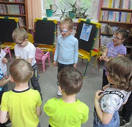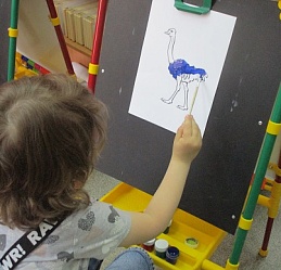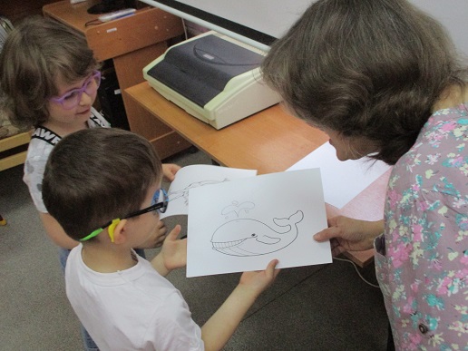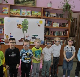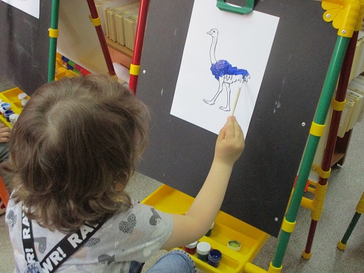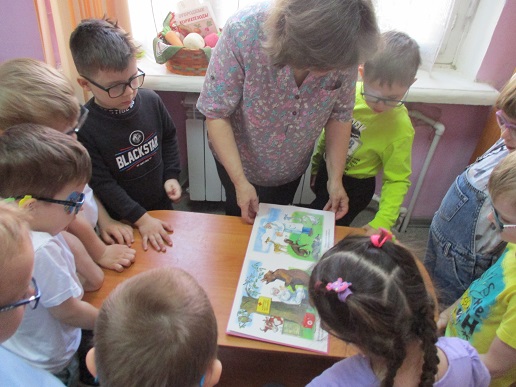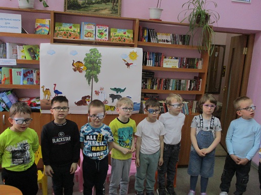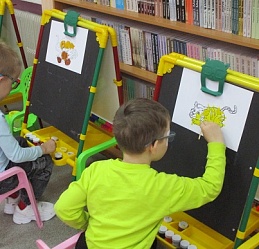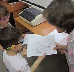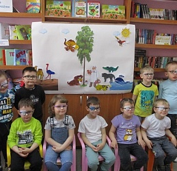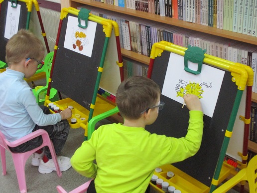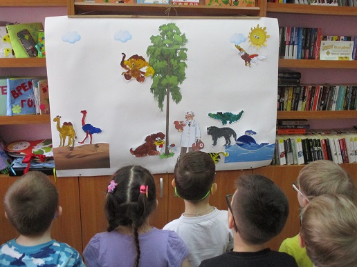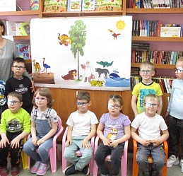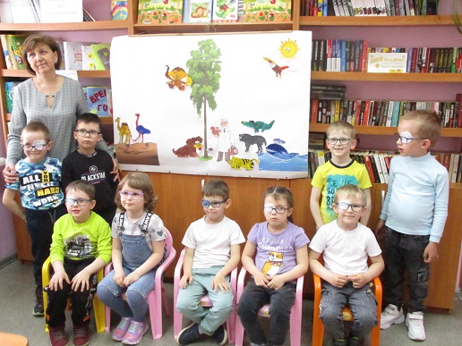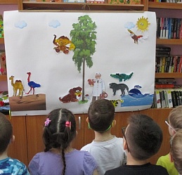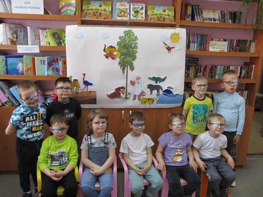 По традиции читающая машина «SARA» озадачила ребят загадками по произведениям Корнея Чуковского, затем дружно хором прочитали книгу «Айболит», изданную Благотворительным фондом «Иллюстрированные книжки для маленьких слепых детей». Выбрать героев сказки для рисования помогла весёлая музыкальная игра с тактильным мячом… и вот в детских руках кисти и гуашь. И пока краска на рисунках с изображением друзей Айболита подсыхала, юные художники посмотрели мультфильм «Путаница», поговорили о важности занятия своим делом и осторожном обращением с огнём; потом отправились размещать на панно с Айболитом разноцветную семью героев сказки.
