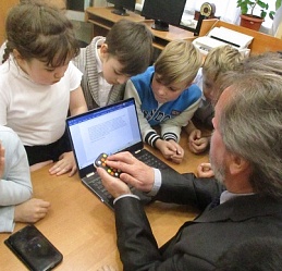 Школьники были удивлены также и возможностями телефона и работы на ПК, чтения «говорящей книги» на тифлофлешплеере, с которыми их ознакомил Алексей Валерьевич.