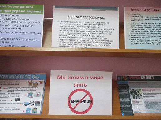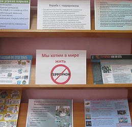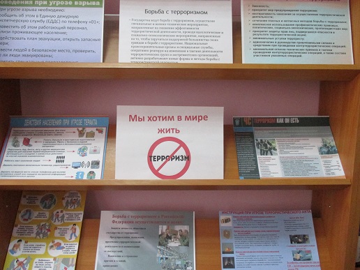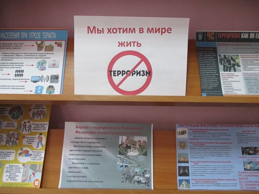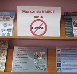 В поддержку этого дня библиотекой подготовлена и оформлена информационная выставка «Мы хотим в мире жить». На выставке представлена информация укрупнённым шрифтом о классификации терроризма, методах борьбы с ним, инструкции и правила безопасного поведения при угрозе террористического акта.