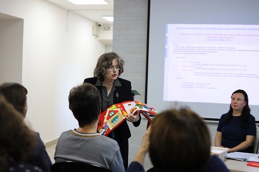 Августа Алексеевна рассказала о специфике работы со слабовидящими и незрячими детьми, об особой тактильной книге, помогающей незрячему ребёнку познавать предметы и явления окружающего мира. Участники круглого стола ознакомились с двумя рукодельными тактильными книгами «Курочка Ряба» и «Репка», изготовленными в ходе первого конкурса на изготовление рукодельной тактильной книги «Познаём мир вместе», проведённого библиотекой в 2018 году, и с желанием откликнулись на предложение принять участие в очередном конкурсе на изготовление рукодельной тактильной книги, который планируется провести в IV квартале текущего года.