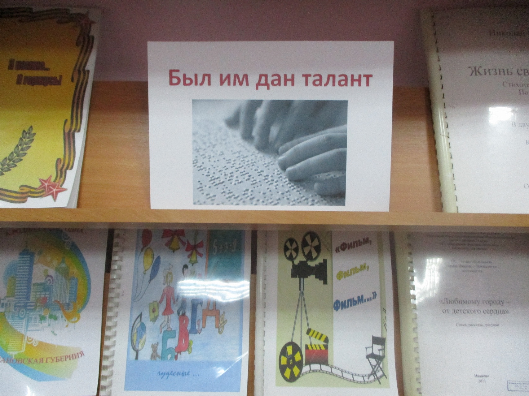 К Международному Дню слепых библиотекой подготовлена книжная выставка «Был им дан талант», на которой представлена часть литературы, изданной библиотекой –это сборники творческих работ учащихся Ивановской коррекционной школы-интерната № 2 по состоявшимся фестивалям детского творчества, а также поэтические сборники самодеятельных незрячих и слабовидящих авторов, членов Ивановской МО ВОС, читателей библиотеки.