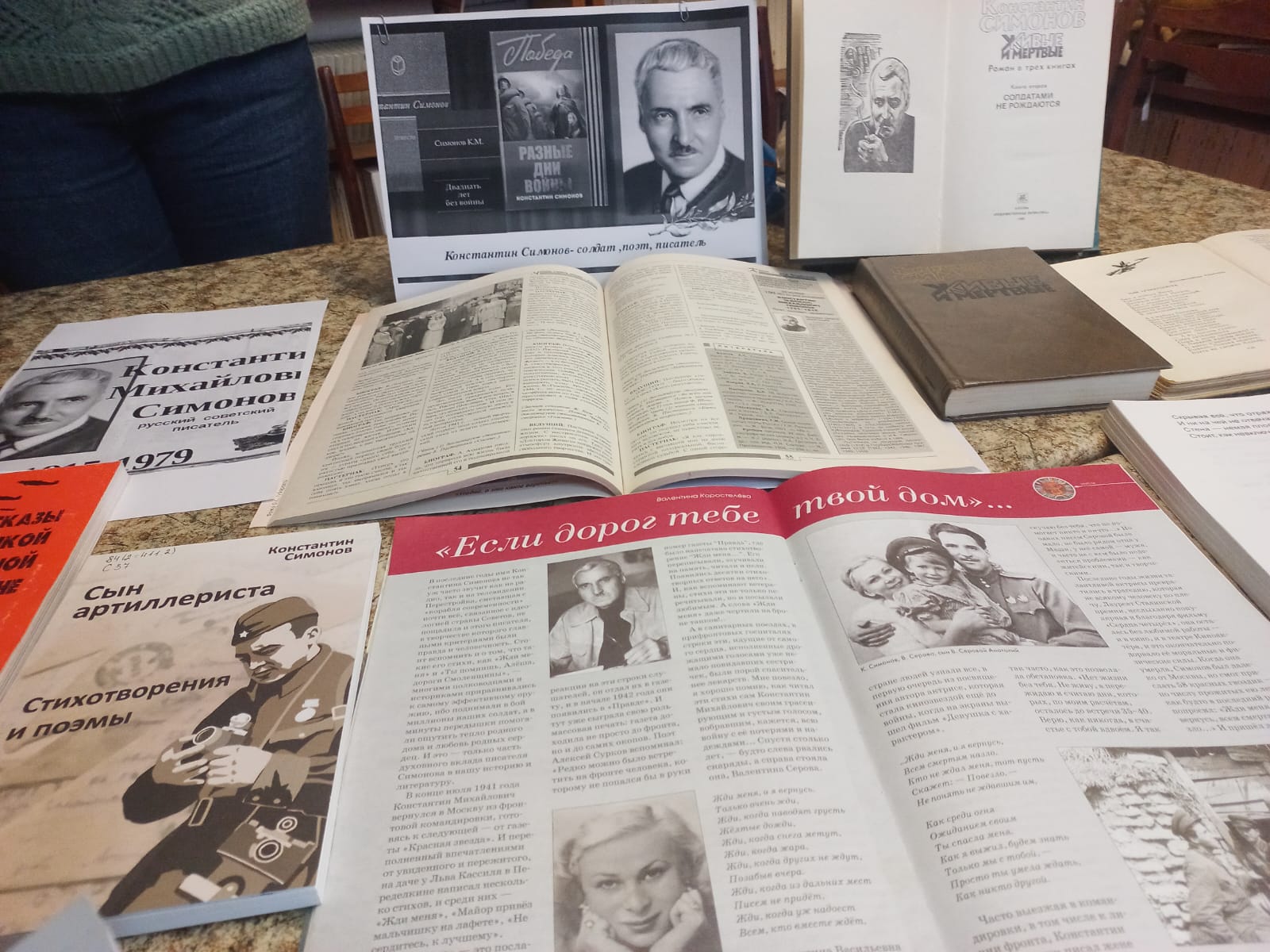Представленная на выставке литература знакомит читателей с творческой и жизненной судьбой Константина Симонова, с его известными произведениями, отразившими события тех военных лет, такими как роман-трилогия «Живые и мёртвые», повести «Дни и ночи», «Двадцать дней без войны».