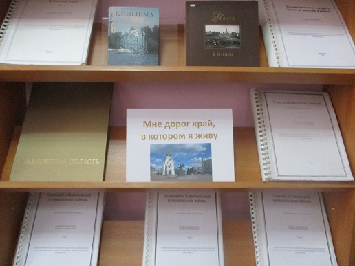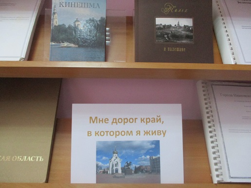 Библиотекой подготовлена выставка «Мне дорог край, в котором я живу», посвященная истории Ивановского края, его географическому положению, его городам и районам. Читатели смогут ознакомиться с образом жизни, традициями и культурой Ивановского края.
