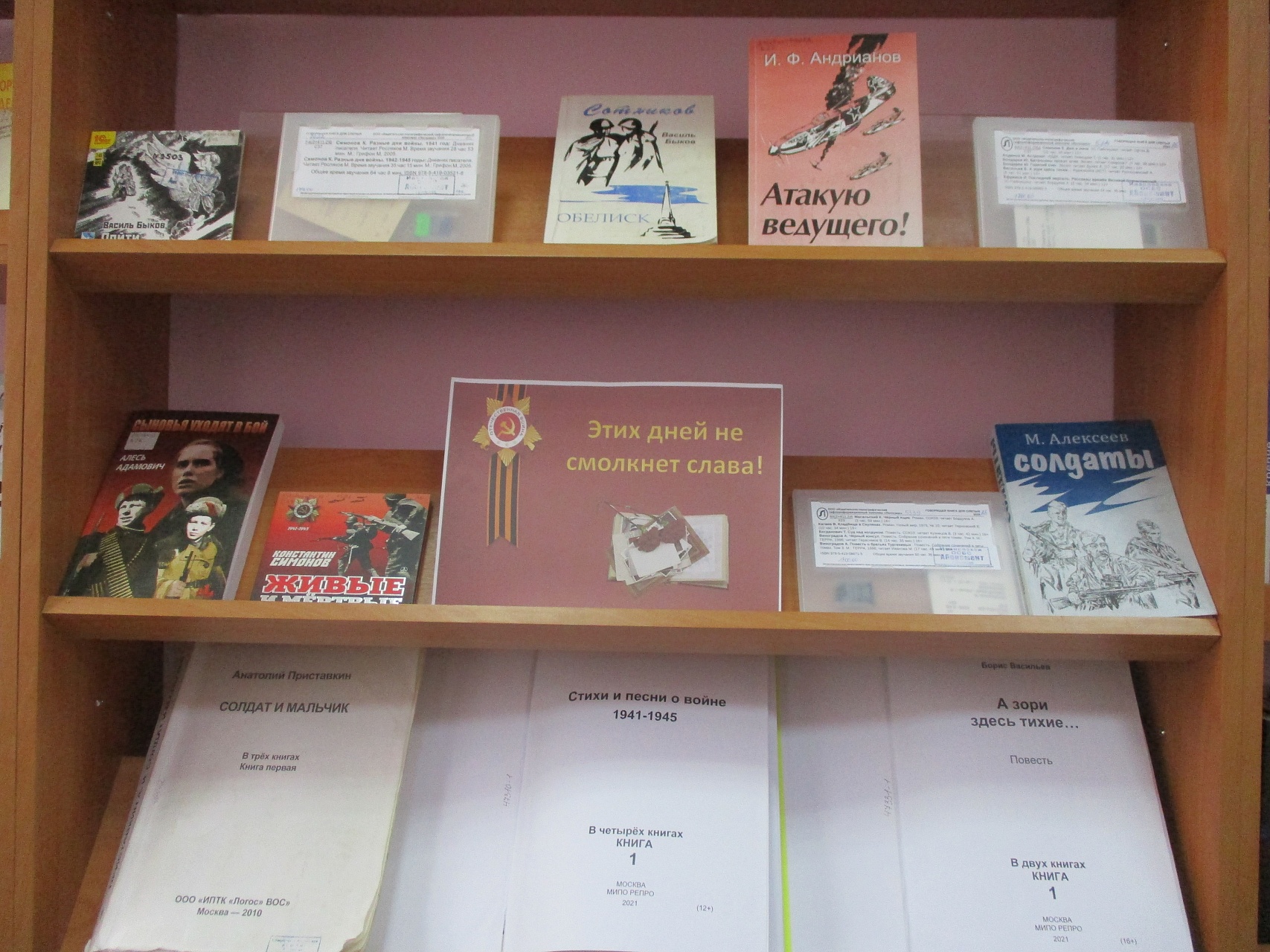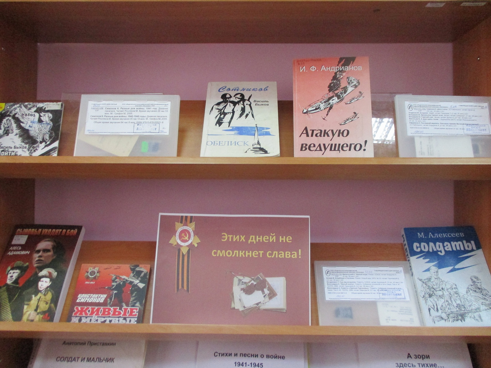 В цикле библиотечных мероприятий, посвященных 80-летию Победы в Великой Отечественной войне, особыми являются книжные выставки. В преддверии Дня Победы начинает действовать книжная выставка «Этих дней не смолкнет слава», на которой представлена литература (в альтернативных форматах) о героизме и мужестве советского народа в годы войны.