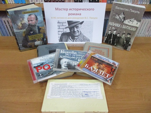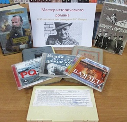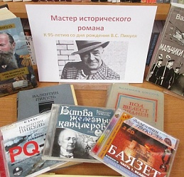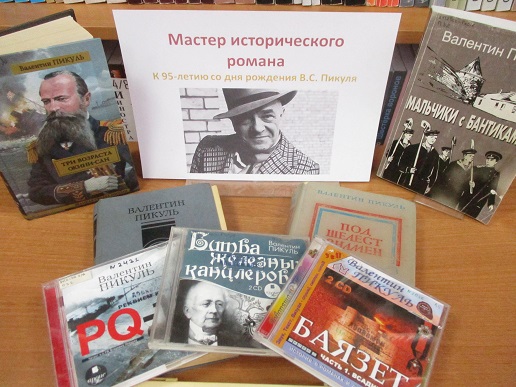 К юбилею В. Пикуля библиотекой подготовлена и оформлена книжная выставка, на которой представлены его художественные произведения на историческую и военно–морскую тематику.