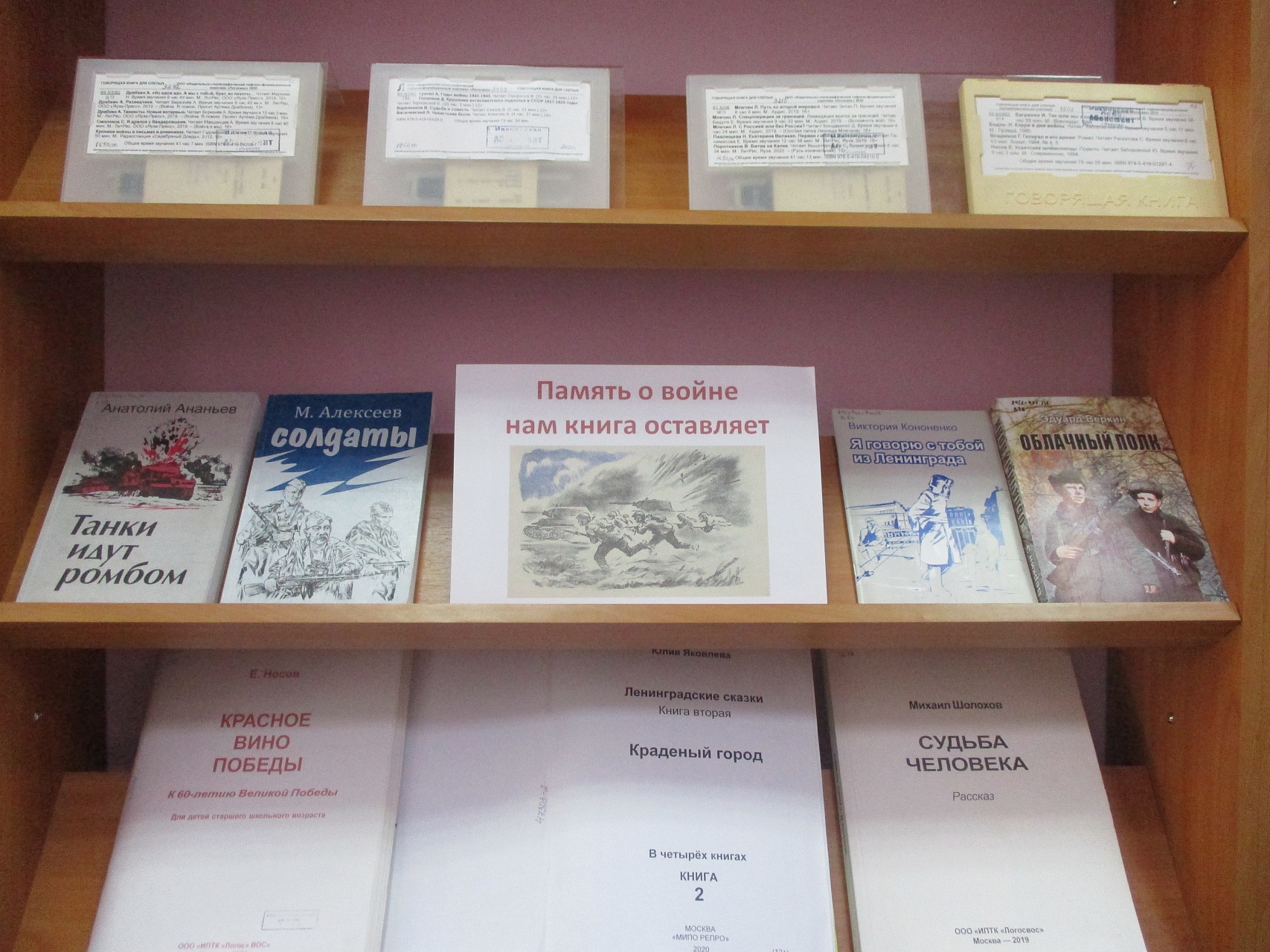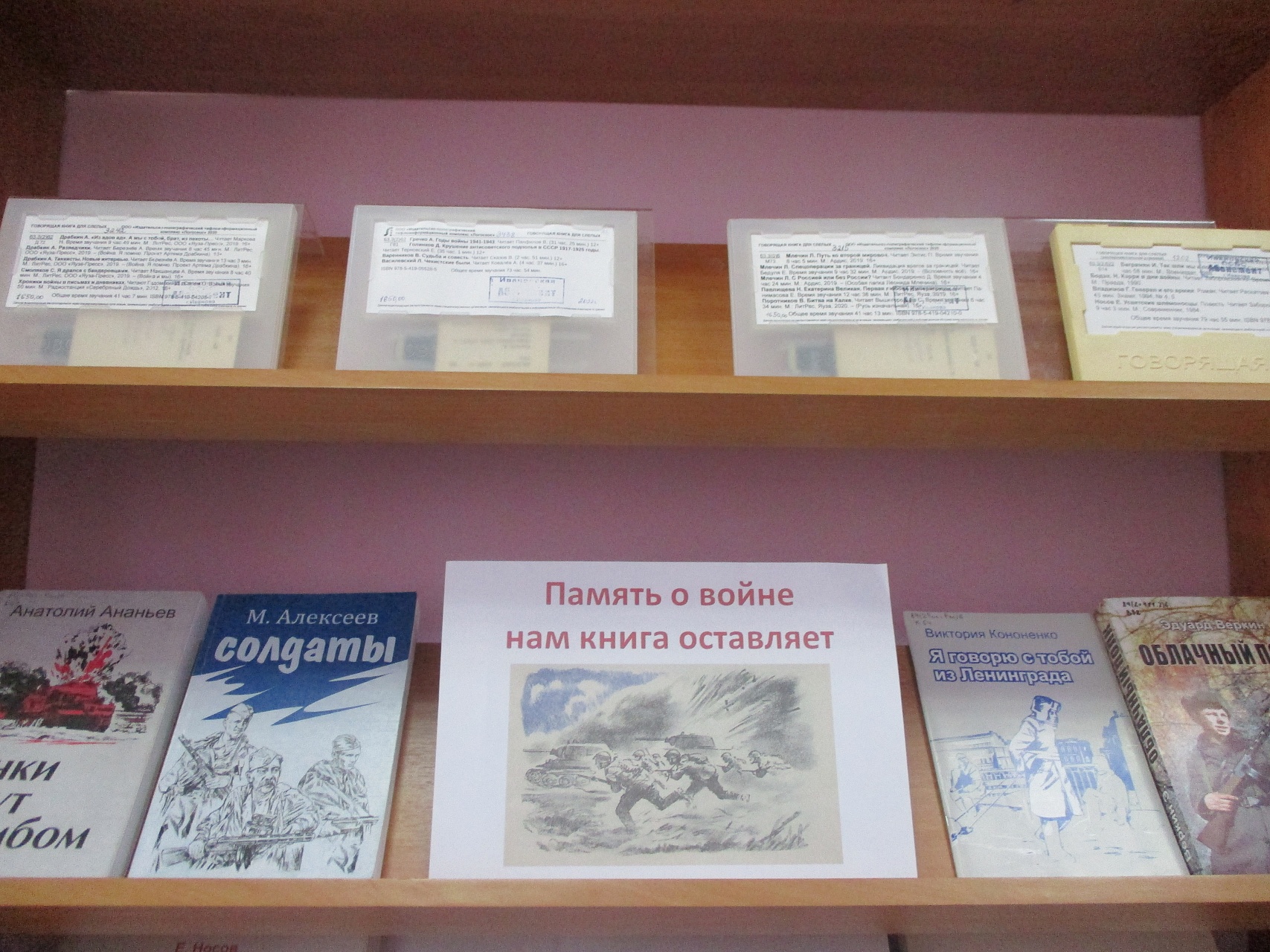 В библиотеке оформлена книжная выставка «Память о войне нам книга оставляет», приуроченная к 22 июня 1941 года, дню начала Великой Отечественной войны. На выставке представлена литература в альтернативных форматах, раскрывающая основные события суровой военной поры, повествующая о людях, которые мужественно и упорно, не щадя своих сил и жизни, в жестоких боях ковали победу над врагом, о тех, кто отстоял свободу и независимость нашей Родины.