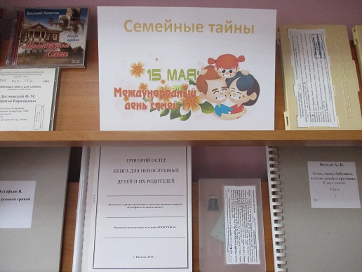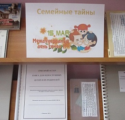 К Международному дню семей, ежегодно отмечаемому 15 мая, библиотекой подготовлена книжная выставка-обзор «Семейные тайны», представляющая литературу о семье, как высшую для человека. Именно с семьи начинается жизнь каждого из нас, в ней закладываются основы личности, она является центром взаимодействия поколений. Этот день позволяет нам лишний раз задуматься о важности семьи в нашей жизни и проявить внимание к близким людям.