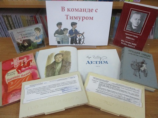 К 120-летию со дня рождения писателя библиотекой подготовлена книжная выставка-обзор «В команде с Тимуром», на которой представлены его лучшие произведения из книжного фонда библиотеки в альтернативных форматах. Особое внимание стоит уделить одному из самых значимых экспонатов – повести для среднего школьного возраста «Тимур и его команда», написанной в 1940 году. Она издавалась в СССР 212 раз и была переведена на 75 языков. Общий тираж составил более 14 миллионов экземпляров. В 2013 году повесть была включена в список «100 книг», рекомендованных школьникам Министерством образования и науки РФ для самостоятельного чтения.