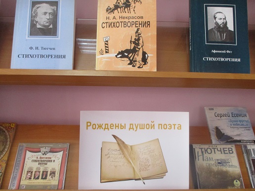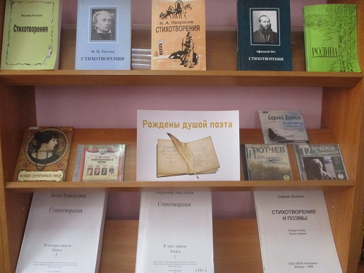 К Всемирному дню поэзии библиотекой подготовлена книжная выставка «Рождены душой поэта», на которой представлены сборники стихов русских поэтов Серебряного века и современных авторов: А. Ахматовой, С. Есенина, О. Мандельштама, А. Блока, М. Цветаевой, Б. Пастернака, Н. Рубцова, Р. Рождественского, Б. Ахмадулиной и др. Поэзия заставляет по-новому посмотреть на жизнь и отношение к природе, любви, дружбе и Родине, дает возможность выразить чувства, которые накопились в сердце.