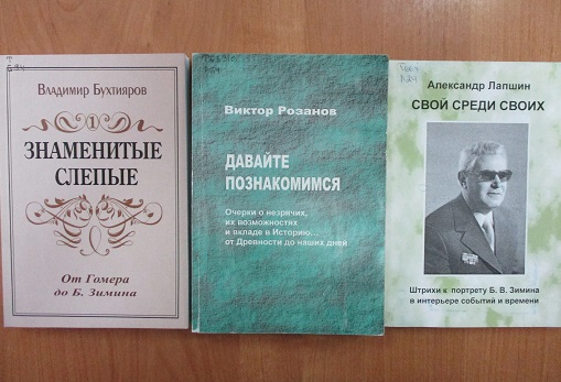 В книгах приводятся статьи о предшественниках, нынешних инвалидов по зрению., от Гомера до Б. Зимина.