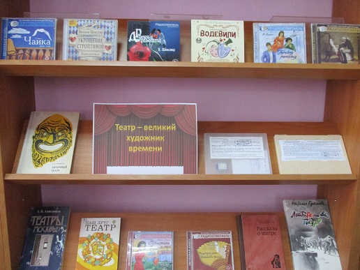 Библиотекой подготовлена книжная выставка «Театр-великий художник времени». Книги, представленные на выставке - о театре, настроении зрительного зала, об актерах – героях книг, помогут открыть многогранный мир театра.