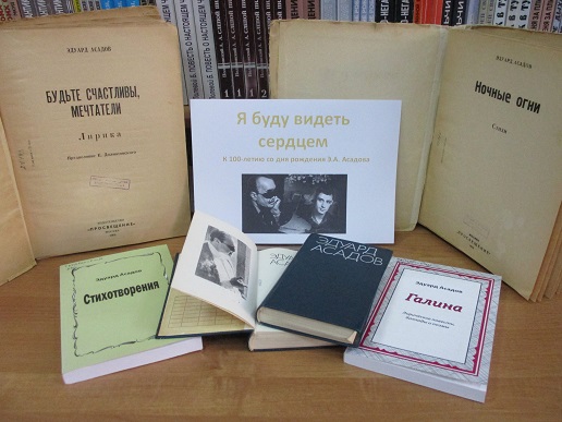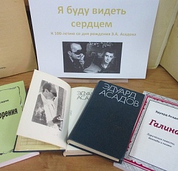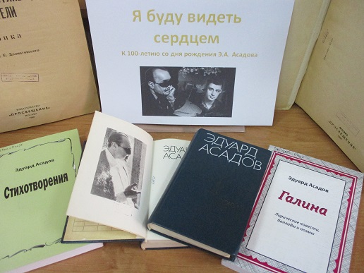 К 100-летию со дня рождения русского поэта и прозаика, участника Великой Отечественной войны Эдуарда Аркадьевича Асадова библиотекой подготовлена книжная выставка «Я буду видеть сердцем». На выставке представлены стихотворения, лирические повести, баллады и поэмы незрячего поэта, который в своём творчестве всегда уважал справедливость, принимая как своих злейших врагов все пороки человечества. Его стихи, как те руки, что помогают подняться тем, кто в беде, горе и печали.