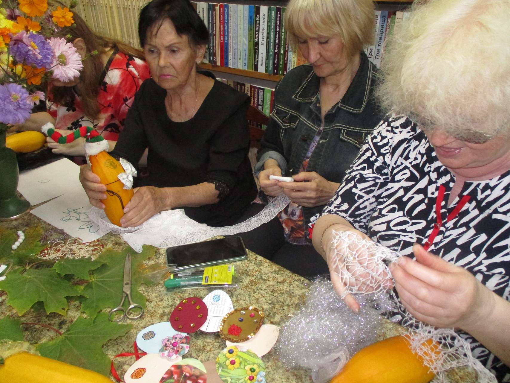 Участники встречи узнали много интересного о приметах осени, вспомнили пословицы, поговорки, ответили на вопросы викторины «Осень в русской поэзии», «Дары щедрой осени», «Осенний калейдоскоп». Все были активны и жизнерадостны, с удовольствием выполняя весёлые конкурсные задания «Нарисуй кленовый листок с закрытыми глазами», «Создай шедевр из кабачка», «Докопайся до истины». Прозвучали и стихи русских поэтов – Ф. И. Тютчева, А. А. Фета, А. Блока, С. Есенина, М. Ю. Лермонтова, М. И. Цветаевой, воспевших красоту родной природы чарующей осенней поры.