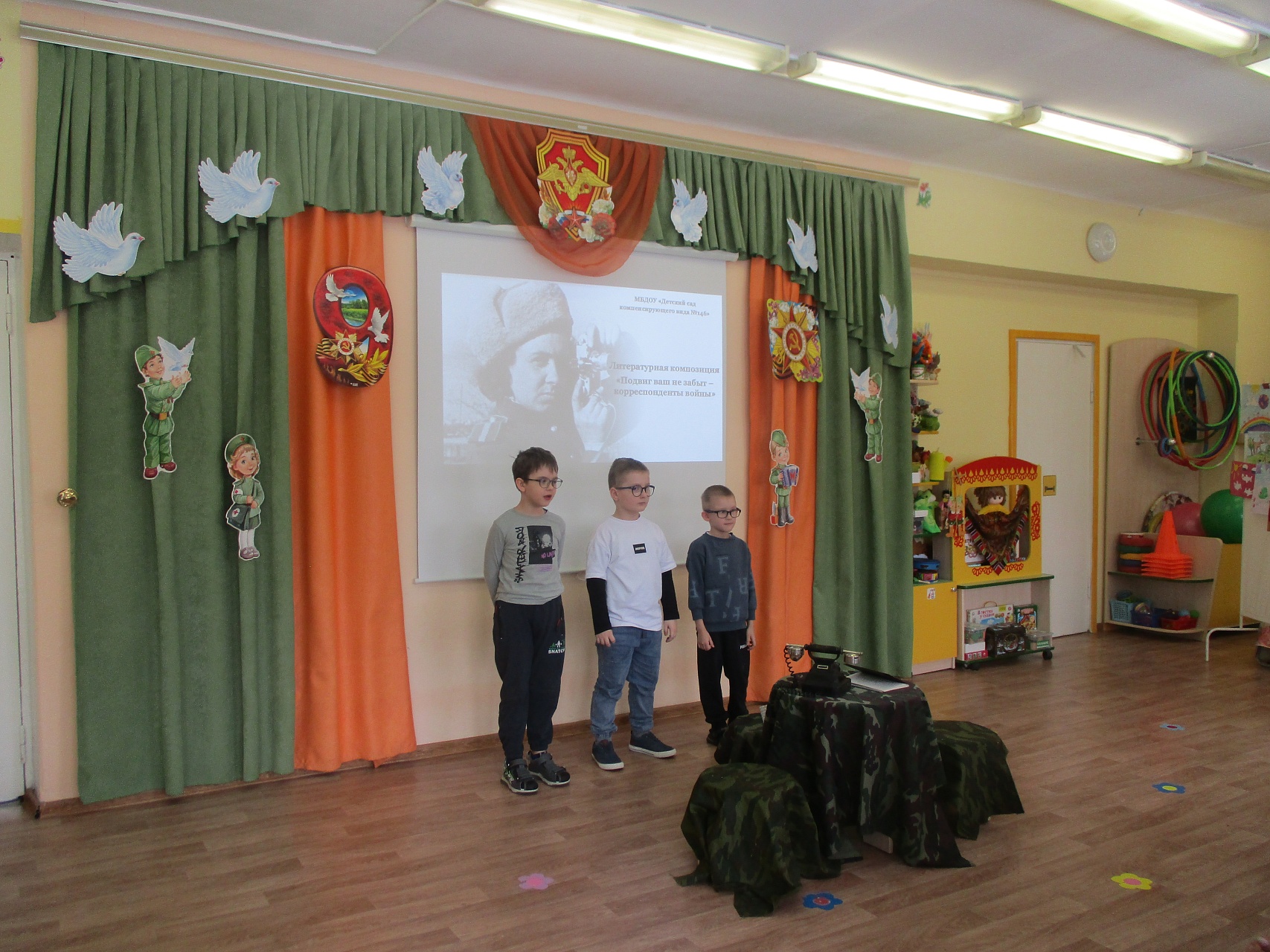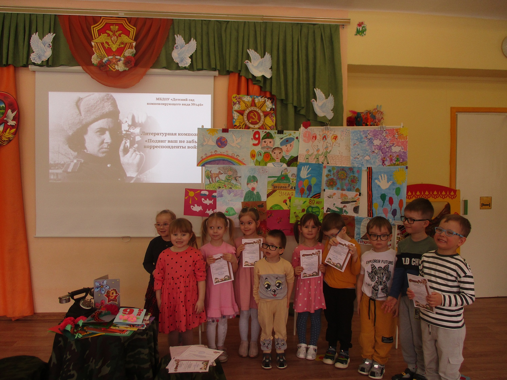 В детском саду компенсирующего вида № 146 (г. Иваново) 10 апреля состоялась концертная программа в рамках VII областного фестиваля детского творчества «Мир важней всего на свете!», в ходе которой воспитанники представили свои фестивальные работы. Трогательными были выставка детских рисунков, сценка «Подвиг ваш не забыт – корреспонденты войны», проникновенно прочитанные стихотворения о подвигах защитников Отечества. Все номера концертной программы сопровождались дружными аплодисментами. По окончании детский сад передал библиотеке поздравительные открытки с Днем Победы, подготовленные воспитанниками и родителями в рамках Благотворительной акции «Мир своими руками» (предыдущие открытки ко Дню защитника Отечества и Международному дню 8 Марта). Открытки будут переданы читателям библиотеки, ветеранам Великой Отечественной войны, труженикам тыла и представителям поколения «Дети войны».