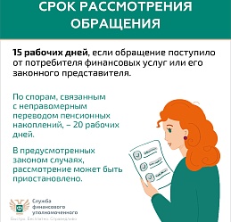Ваши обращения финансовый уполномоченный рассматривает 15 рабочих дней (по спорам, связанным с неправомерным переводом пенсионных накоплений, – 20 рабочих дней) – без вашего визита. Никуда не нужно ходить.