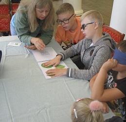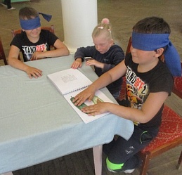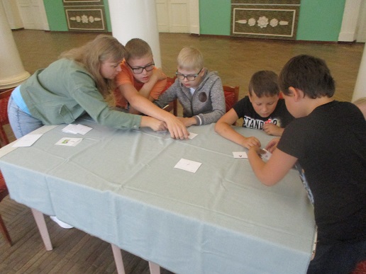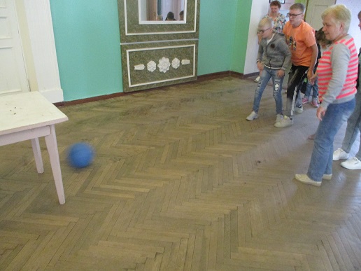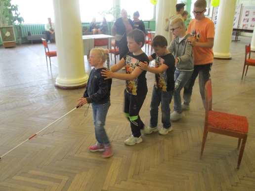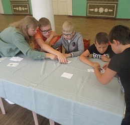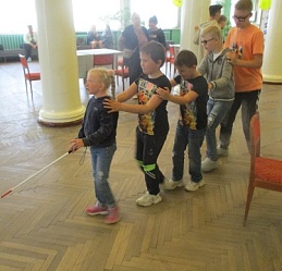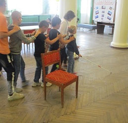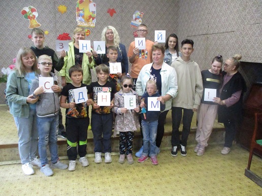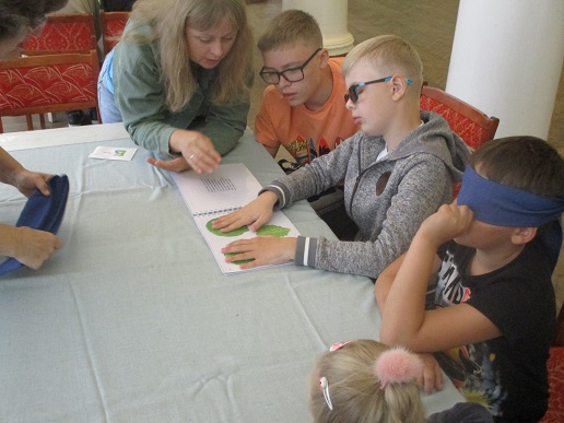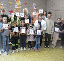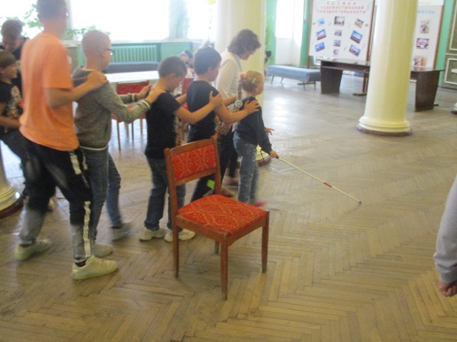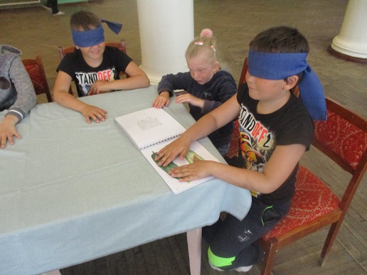 Две команды детей при сопровождении родителя-взрослого успешно выполняли предложенные конкурсные задания: «Загадки-прочитайки» на школьную тематику (составить слова-отгадки из карточек с буквами в укрупнённом и рельефно-точечном шрифте), «Весёлый блиц-турнир» о школьных предметах, «Тифлоузнавание» («чтение» тифлокниг-пособий об овощах и фруктах); спортивные состязания «Меткий бросок» (попадание звуковым мячом в импровизированные ворота) и «Нет препятствиям с помощницей-тростью!». За каждое выполненное задание команды получали буквы, из которых в завершении сложили квестовое словосочетание: «Знания – сила!». Дети с большим успехом вместе с родителями отгадали героев мультфильмов в Мультвикторине. Ивановская МО ВОС вручила школьникам сладкие гостинцы, Захарова Ольга Ивановна, бабушка Соловьёва Саши угостила всех сладким пирогом.
