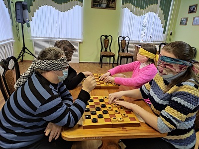 В течение почти двух часов, в полной темноте, с повязками на глазах, ориентируясь только на слух и осязание и собственное ощущения, молодым инвалидам предстояло побывать в совершенно разных пространствах. Им предстояло справиться с различными заданиями: решить бытовые задачи, поиграть в шашки, пройтись с тростью, проявить свои творческие способности. Каждое испытание позволило пережить различные ситуации, с которыми приходится сталкиваться людям, лишенным зрения.