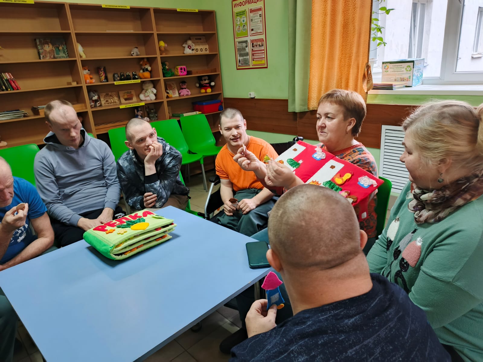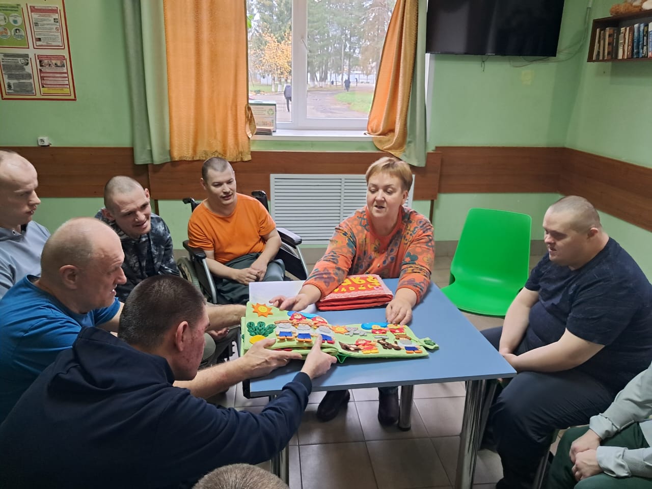 Литературная горница «Народных сказок хоровод», совместное мероприятие Кинешемского филиал № 1 Ивановской областной специальной библиотеки для слепых и Библиотеки-филиала № 2 МУ «Кинешемская городская централизованная библиотечная система», состоялась в Кинешемском доме-интернате для получателей социальных услуг отделения интенсивного ухода «Милосердие. Участники погрузились в мир сказок, активно взаимодействуя с рукотворными тактильными книгами и пальчиковым театром. Инсценировка сказок «Репка» и «Курочка Ряба» позволила почувствовать себя настоящими актерами, развить мелкую моторику и вспомнить любимые сказки. Инсценировка сказки «Теремок» с помощью пальчиковых кукол, где каждый персонаж оживал в руках, вызвал восторг у «актёров». В завершение занятия молодые люди пришли к выводу о важности дружбы и взаимопомощи, чему в немалой степени содействует народная сказка и театральное искусство.