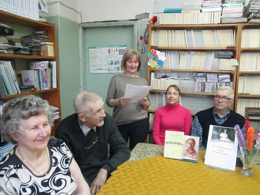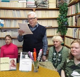 Ведущий библиотекарь Шуйского филиала № 1 Татьяна Виноградова 12 апреля для читателей, членов Шуйской МО ВОС провела литературную гостиную «Поэзия – лекарство для души». Мероприятие состоялось в цикле вечеров-портретов «Имена, которые мы помним» в рамках проекта «Подводим итоги, двигаемся вперед» к 100 -летию создания Ивановской областной организации .