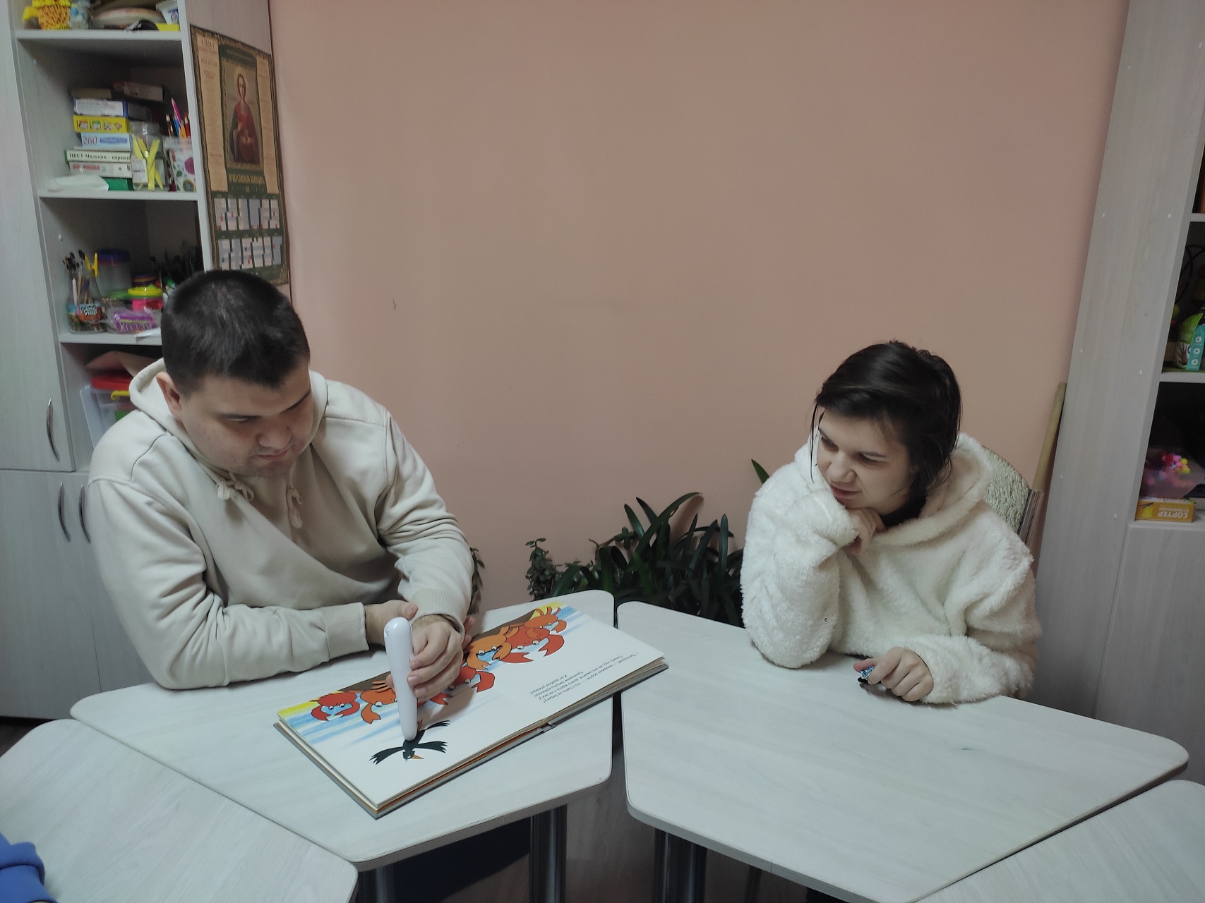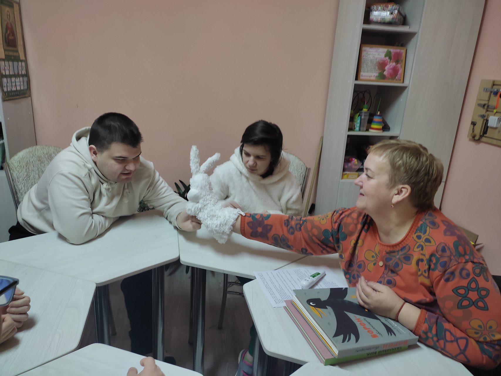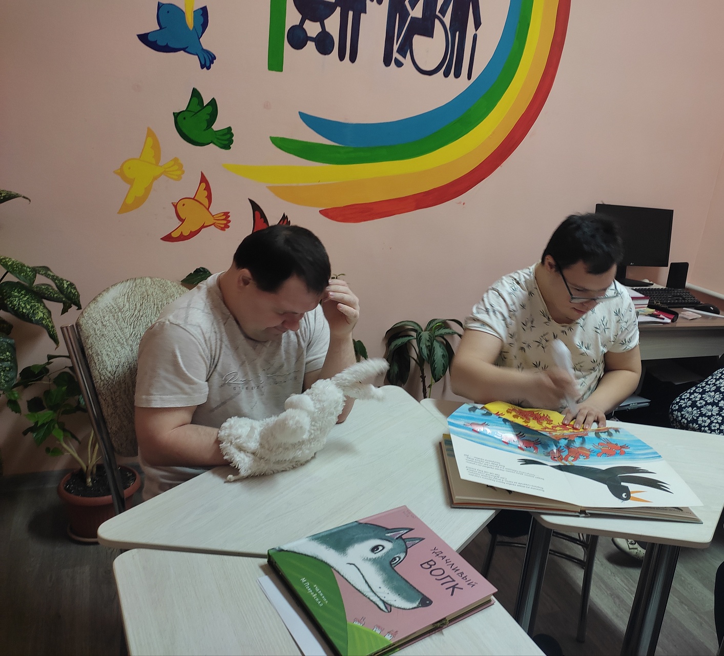 В ходе занятия были представлены две книги «Ворон-обманщик» по мотивам североамериканской сказки и «Удачливый волк» по мотивам португальской сказки из серии «Волшебный карандаш» Благотворительного фонда «Книжки для маленьких слепых детей». Молодых людей поразила красочность книг, возможность тактильно «прочесть» страницы; услышать увлекательный рассказ о том как зло наказывает само себя, как часто мы оказываемся сильнее зла, сами того не ожидая. Мероприятие получилось познавательным и интересным.
