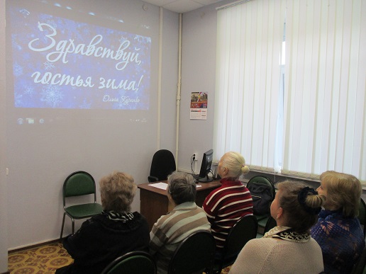 В клубе активного долголетия «В кругу друзей» при Ивановском комплексном центре социального обслуживания населения 28 ноября состоялся литературно-музыкальный калейдоскоп «Здравствуй, матушка-зима!», начавшийся с разговора-размышления о том, почему зимнее суровое время года пользуется в России народной любовью. Выдвигались различные версии, весёлые и серьёзные. В ходе встречи прозвучали стихи русских поэтов В. Брюсова, Н. Огарёва, И. Никитина о чарующей красоте зимней природы; в видеозаписи – старинные романсы и песенные произведения о зиме, в том числе, и впервые прозвучавшие в советских кинолентах, предварявшее исполнение интересными фактами их создания поэтами и композиторами: такие, как «Дин-динь-динь», «Вдоль по улице метелица метёт», «Ой, мороз-мороз-мороз», «Белым снегом». «По тропинке, снежком запорошенной», «А снег идёт» и другие, ставшие неотъемлемой частью русской культуры. Участники встречи были удивлены тем, что некоторые из прозвучавших песен, считавшихся народными, имеют авторов, и с удовольствием подпевали любимым мелодиям.