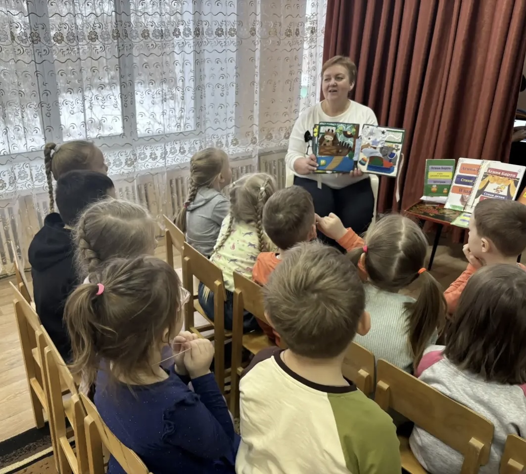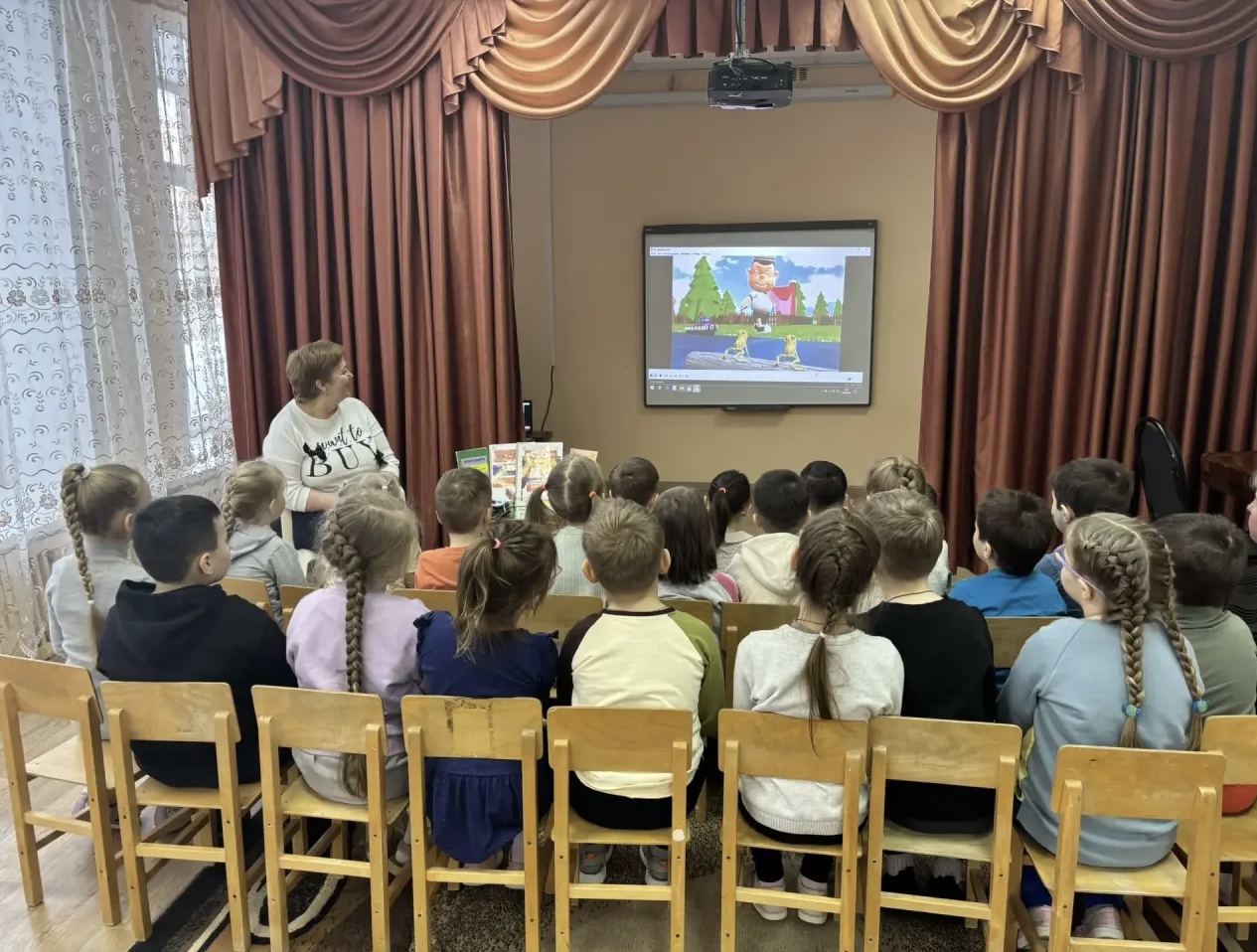Вместе с библиотекарем хором читали любимые четверостишия для самых маленьких («Уронили мишку на пол», «Идёт бычок, качается» и другие). С большим вниманием просмотрели видео-подборку «Мульт-песенки по сборнику А. Барто «Игрушки». Интересно было наблюдать, что произведения классика детской литературы не только вызывают улыбку и детский смех, но и заставляют задуматься о доброте, ответственности, сострадании и заботе.