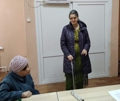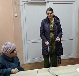Затем Наталья Болотова, инвалид I группы по зрению, провела мастер-класс по ориентировке в пространстве при помощи трости для людей с глубоким нарушением зрения. Участники встречи ознакомились с различными видами устройства трости, а также узнали о различных техниках владения тростью, такие как диагональная (чаще всего используется в помещениях или на знакомых маршрутах) и маятниковая, применяемые на новых и сложных маршрутах.