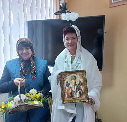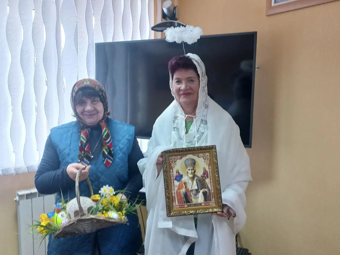 В течение мероприятия звучали трогательные стихи о Пасхе, а для полного погружения в атмосферу праздника Зинаида Головкина и Любовь Илюшина, активные участницы Центра общения, представили зрителям небольшую сценку под названием «Бабка Праска и Ангел».