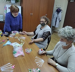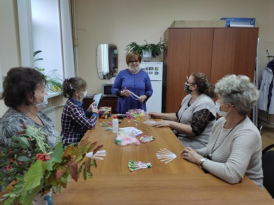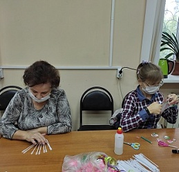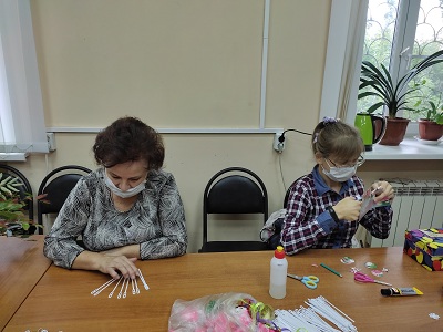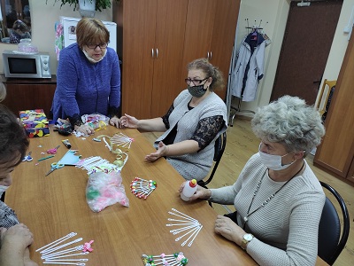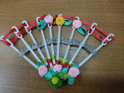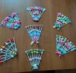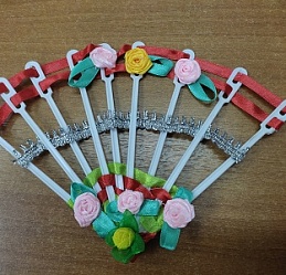 До начала работы Наталья Ильинична продумала стилистику и тему композиции, подобрала материал. Рукодельницы с удовольствием мастерили веера из пластиковых палочек и придумывали разнообразные способы их украшения.