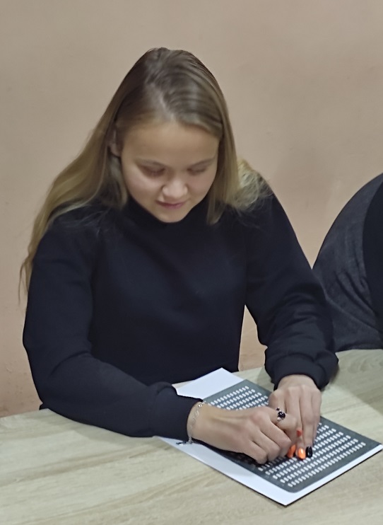 Ведущие мастер-класса Марина Горбачева и Анастасия Курмакаева рассказали участникам о принципах рельефно-точечной системы, её роли в жизни незрячих, её создателе Луи Брайле. Используя алфавит, специальный письменный прибор и грифель, участники мероприятия совместно с Анастасией Александровной написали свои имена, фамилии и слова приветствия.