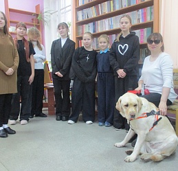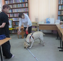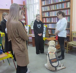 В ходе тематической встречи «Благодаря и вопреки» гости познакомились с , руководителем клуба владельцев собак-проводников Светланой Каретиной и лабрадором Флаем. Светлана Александровна доходчиво и подробно рассказала о том, как и где воспитываются и обучаются будущие собаки-проводники для незрячих людей, поделилась своими жизненными историями, связанными с ответственной службой Флая, сделав акцент на правильности оказания необходимой помощи человеку с инвалидностью. Участники встречи ознакомились с выставкой портретов собак-проводников незрячих читателей библиотеки и выставкой книжных изданий специальных форматов, в том числе учебной литературы для незрячих школьников. Гости виртуально познакомились с некоторыми из них, посмотрев видео ролики из библиотечного архива.